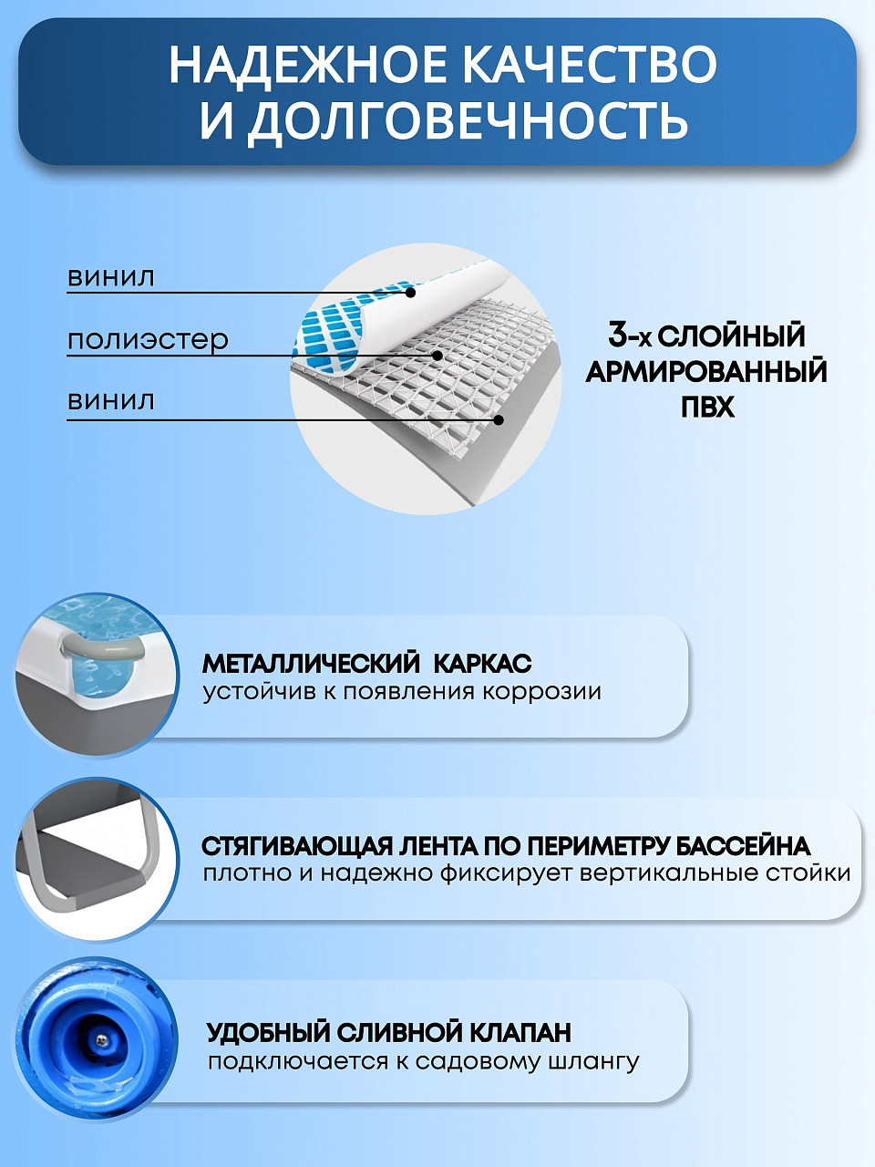 - Трёхслойный ПВХ и стальная рама выдерживают интенсивное использование до 12 месяцев гарантии
