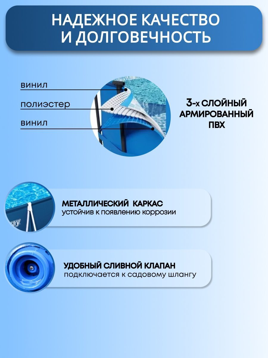 Каркасный бассейн Bestway Steel Pro 56405 — это надежный выбор для тех, кто ищет, какой бассейн купить для дачи или дома без лишних хлопот. Прямоугольная форма и вместимость 5700 литров делают его отличным вариантом для семейного отдыха и детских игр. Трехслойный ПВХ защищает чашу от проколов, а стальной каркас гарантирует устойчивость даже при интенсивном использовании. Вопросы «подходит ли для детей» и «насколько просто собрать» — самые частые среди покупателей: сборка занимает до 120 минут, а высокий бортик и глубина 81 см обеспечивают комфортную зону для плавания.