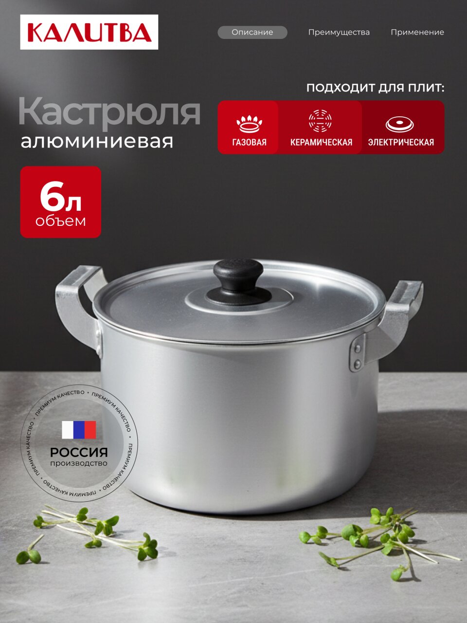 Закажите алюминиевую кастрюлю Калитва 6 л по выгодной цене — это выбор, проверенный временем. Гарантия 24 месяца, быстрая доставка и консультации эксперта по подбору объёма и типа плиты. Оформите заказ сейчас и получите надежную посуду для дома и дачи.