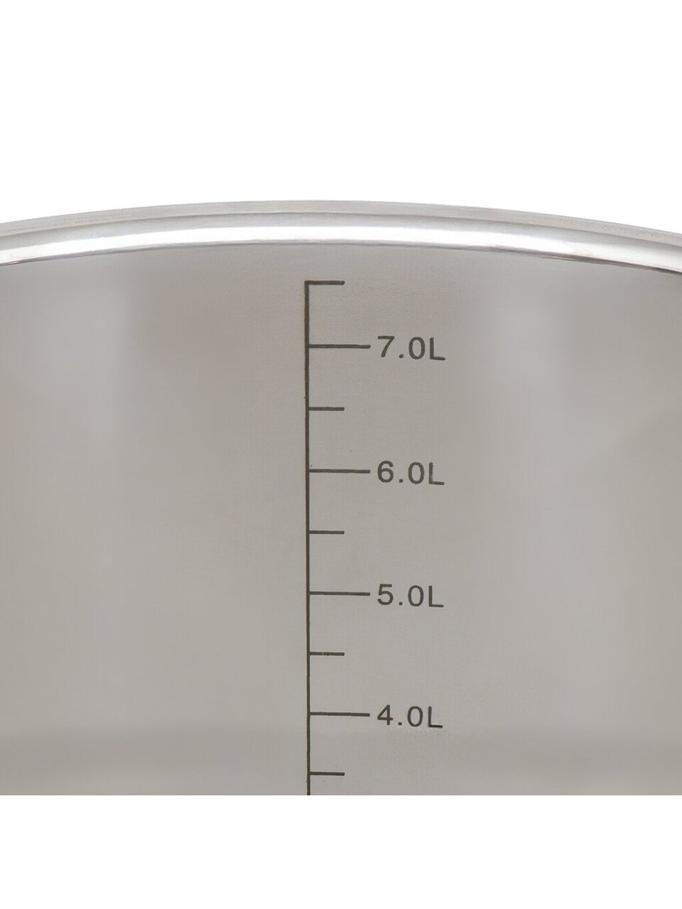 - Объём 8 л, мерная шкала, стеклянная крышка с клапаном — удобно готовить супы, макароны, пельмени для всей семьи