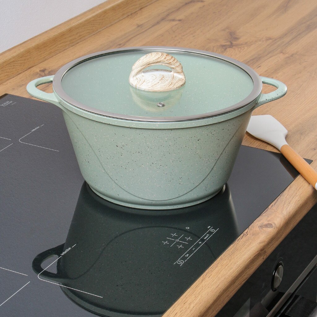 Кастрюля Гурман Мята 5 л — это современное решение для тех, кто ищет, какую кастрюлю выбрать для повседневной готовки. Прочный алюминиевый корпус с толстым дном (5,5 мм) обеспечивает быстрый и равномерный нагрев на любых плитах, включая индукционные. Гранитное антипригарное покрытие позволяет готовить без масла и легко отмывать посуду после использования, что особенно важно для семей с детьми или тем, кто ценит время. Стеклянная крышка с выпускным клапаном сохраняет аромат блюд и предотвращает выкипание, а мятный цвет добавляет свежести интерьеру кухни.
