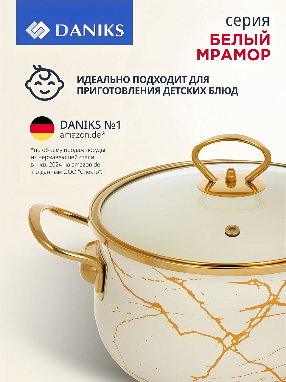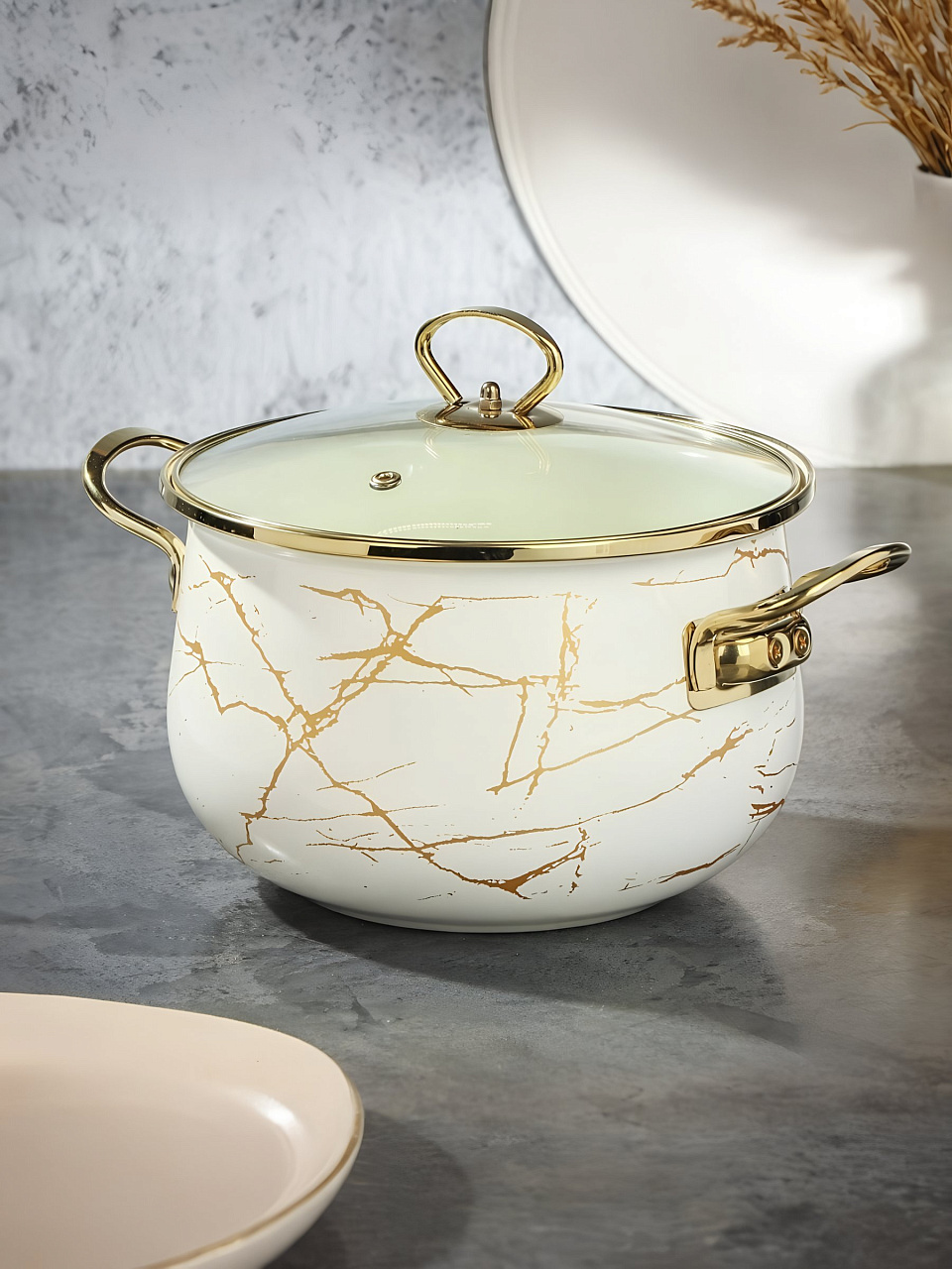 Кастрюля эмалированная Daniks 4 л с крышкой из стекла: стиль «Белый мрамор», подходит для индукции, универсальна для дома и дачи — выгодное решение для ежедневной готовки.