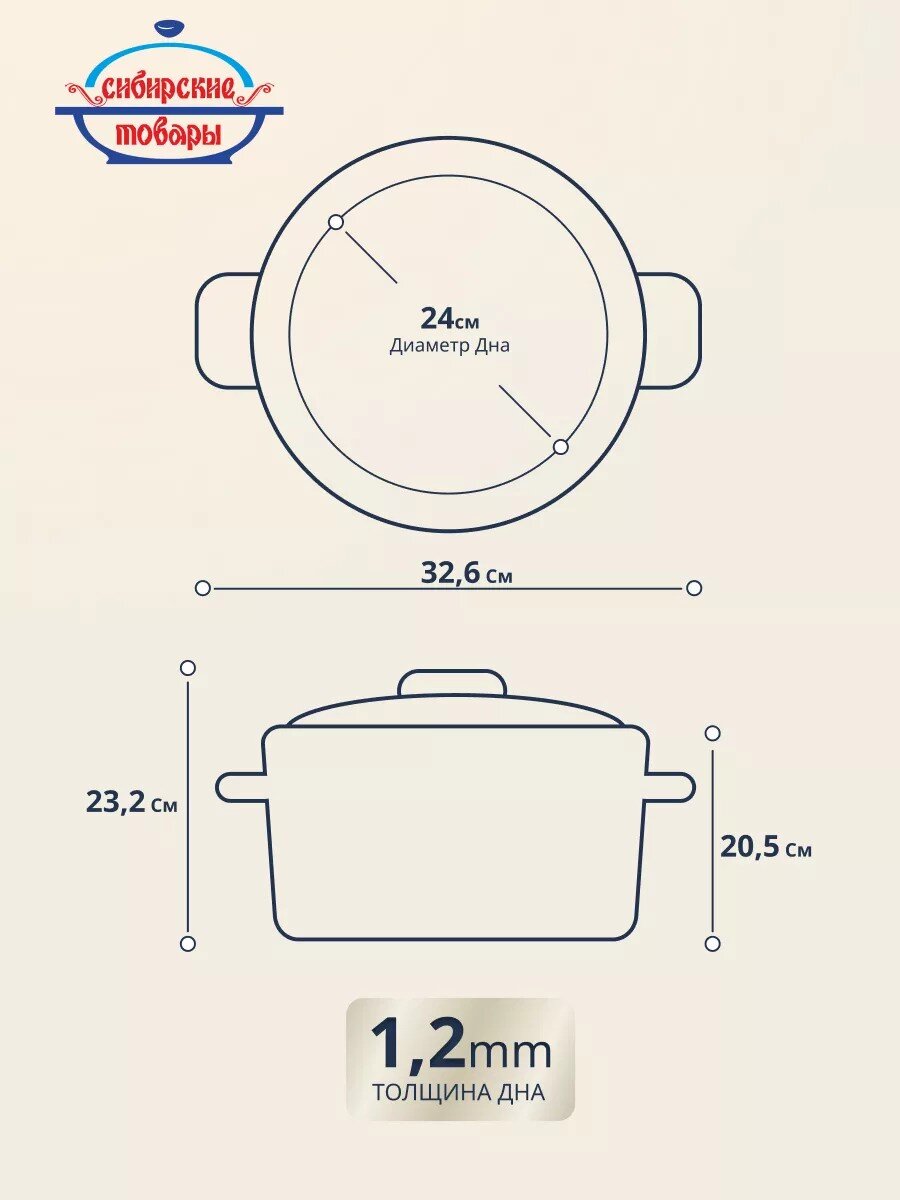 Объем — 9 литров, диаметр — 24 см, форма цилиндрическая, вес — 1,25 кг, толщина дна — 1,2 мм.
