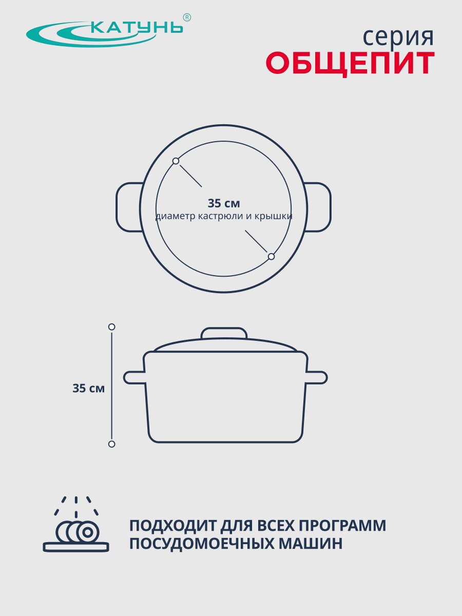 Диаметр кастрюли и крышки — 35 см, высота с крышкой — 22 см. Это оптимальный размер для приготовления больших объёмов еды.