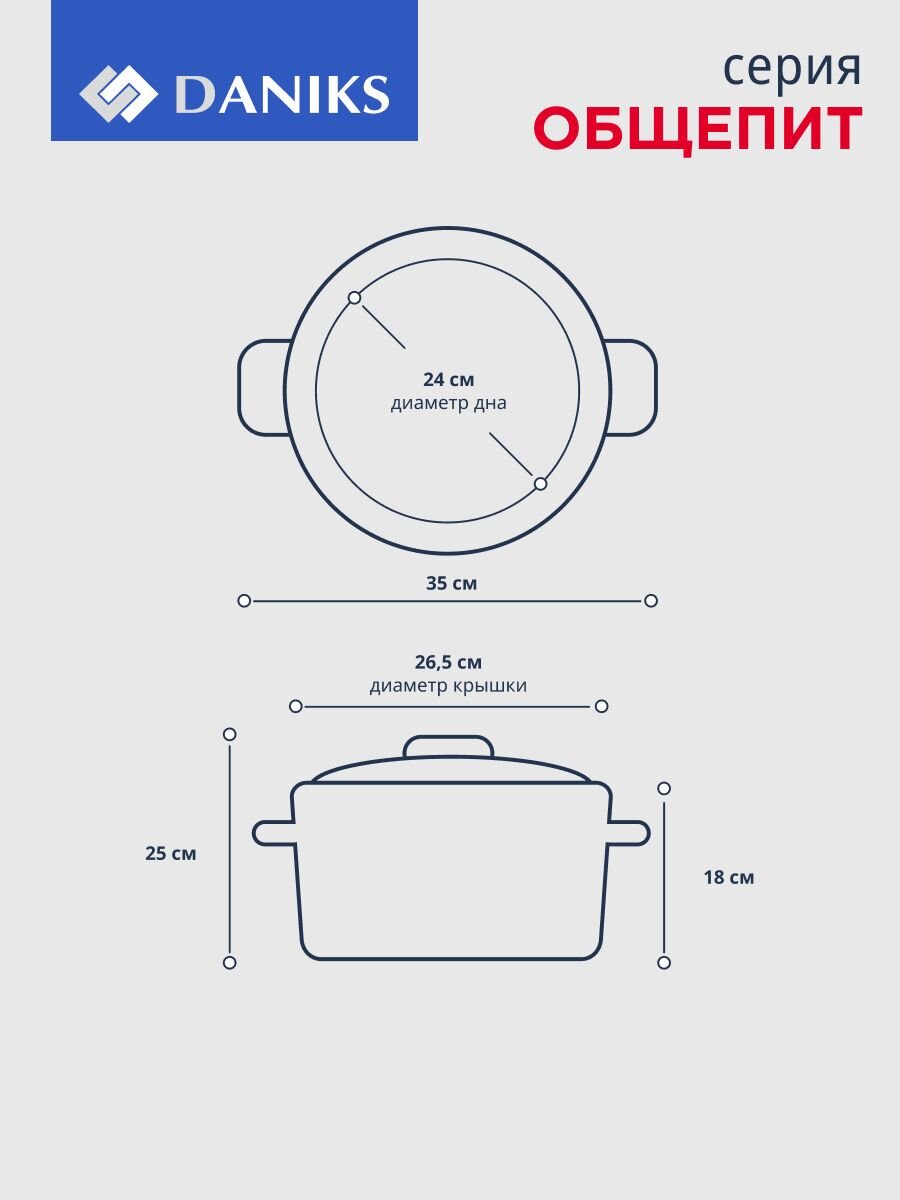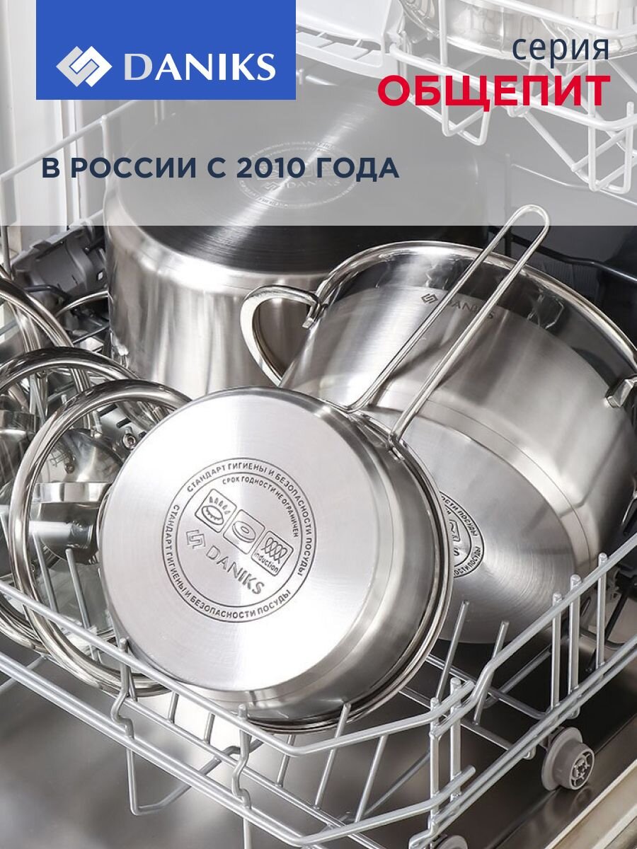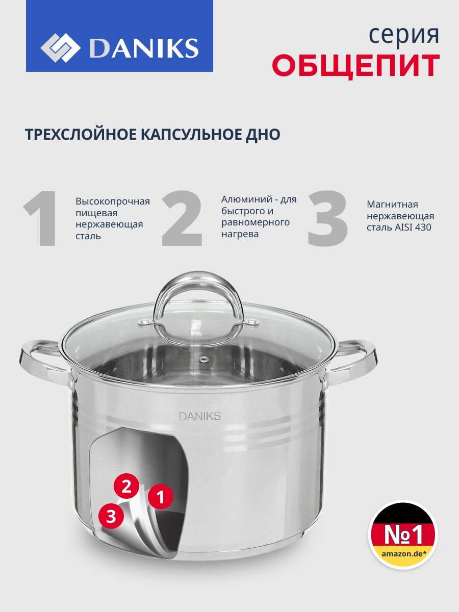 Кастрюля Daniks 9 л из нержавеющей стали с капсульным дном — для индукции, газовых и электрических плит. Прочный корпус, мерная шкала, стеклянная крышка — удобно для дома и общепита.