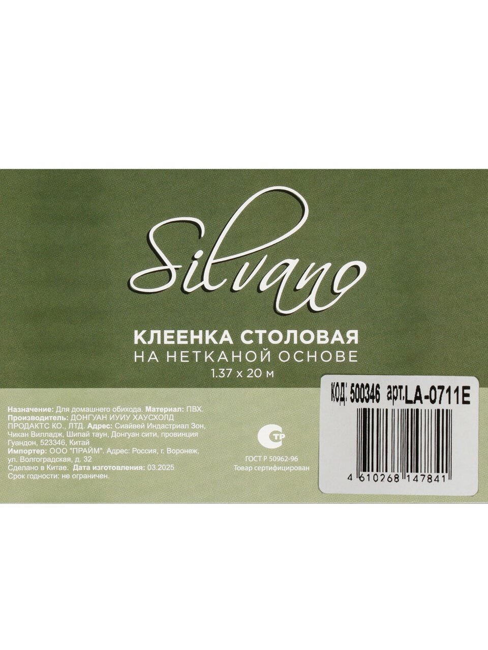 Рулон клеёнки Silvano имеет ширину 1,37 м и длину 20 м (2000×137 см). Материал легко режется обычными ножницами — выберите подходящий кусок для стола, полки или подоконника.