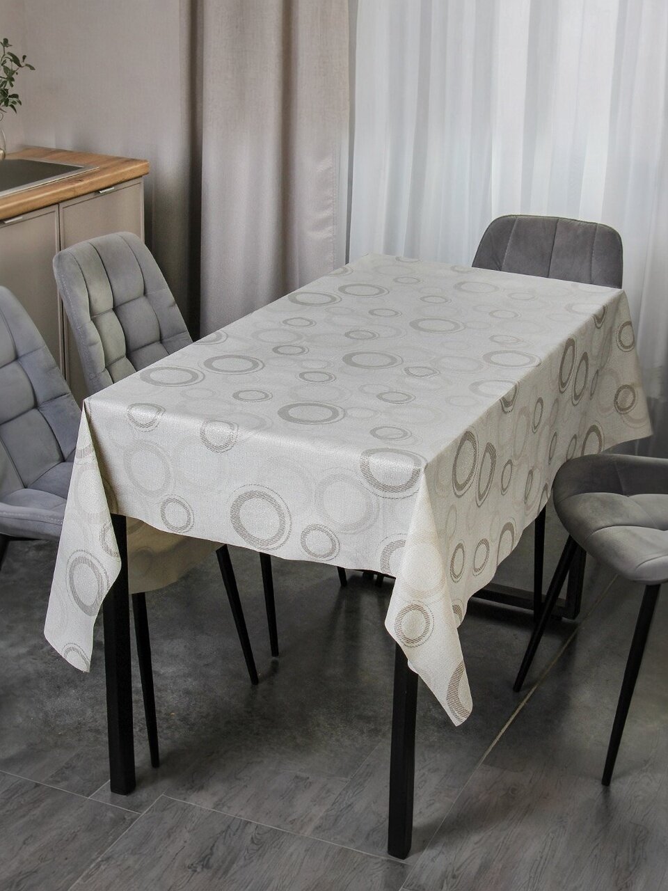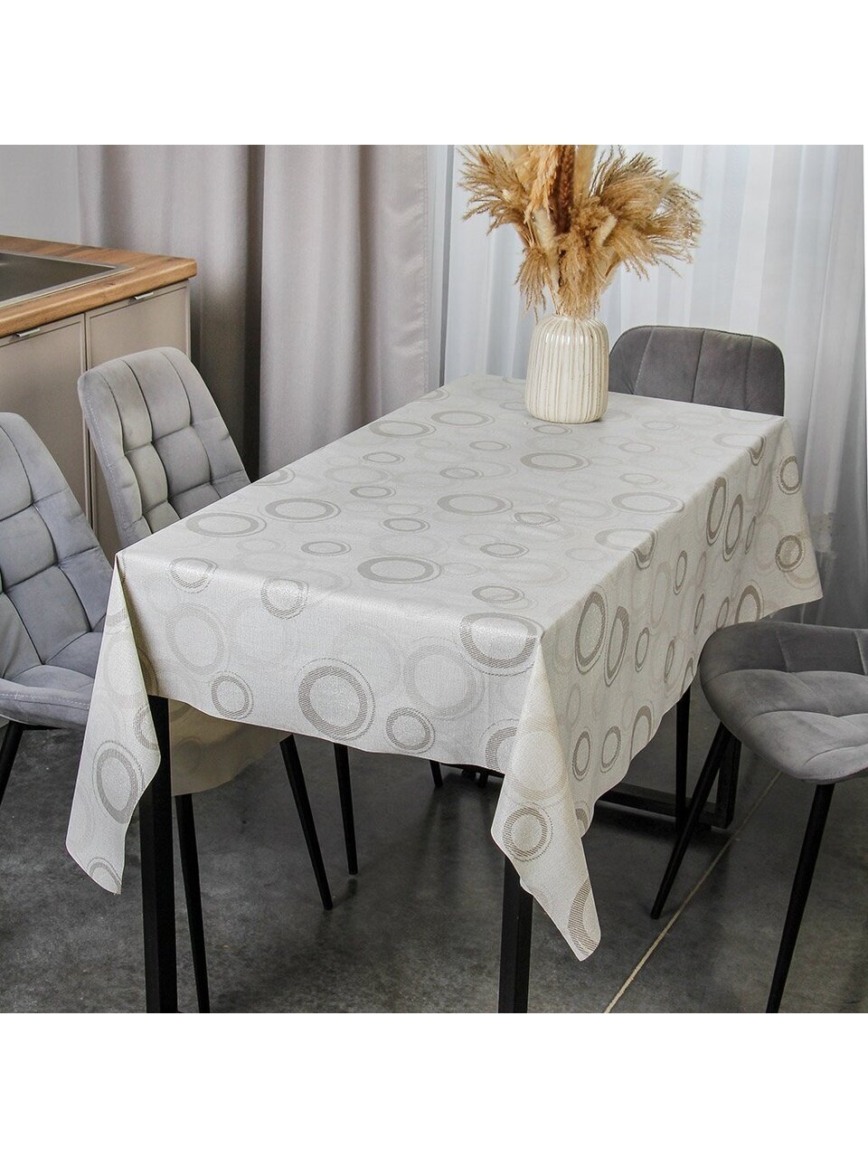 Современный дизайн "Глиттер" с абстрактными элементами добавляет интерьеру изысканности и легкости. Скатерть станет отличным выбором для ежедневных приемов пищи, семейных ужинов, праздничных мероприятий и встреч с друзьями. Универсальный оттенок подойдет как для классических, так и для современных интерьеров, а также легко сочетается с различной посудой и текстилем.
