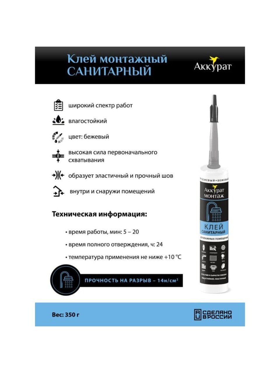 Клей монтажный Аккурат Санитарный предназначен для монтажа широкого спектра отделочных материалов и декоративных элементов. Применяется в местах, подверженных воздействию влаги: ванные комнаты, кухни, подвалы.