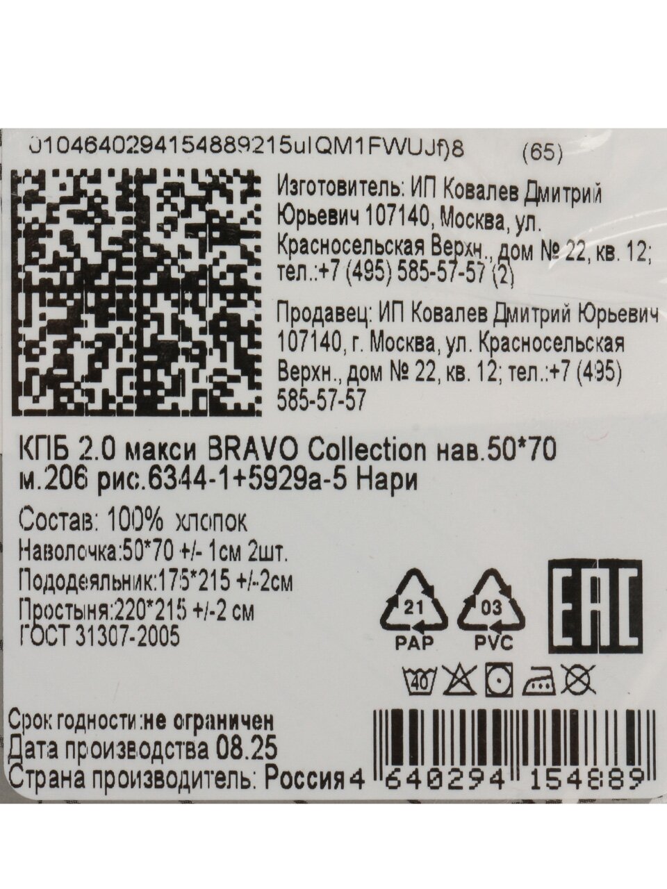 Комплект Bravo Нари рассчитан на стандартную двуспальную кровать: простыня 215×220 см, пододеяльник 175×215 см, 2 наволочки 50×70 см. Эти параметры подходят для большинства классических матрасов и одеял.