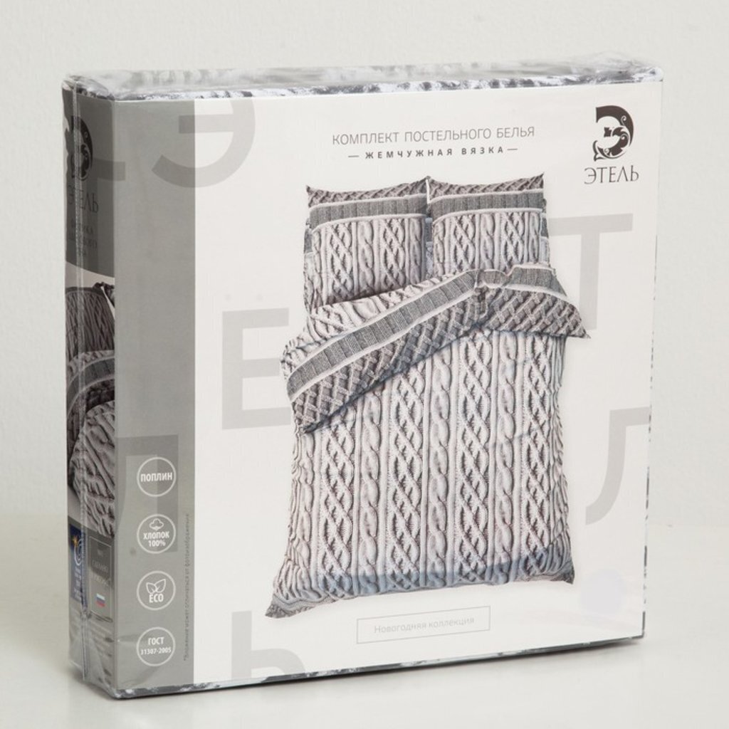 Евро: пододеяльник, 200 × 217 см — 1шт.; простыня, 220 × 240 см — 1 шт.; наволочка, 70 × 70 см — 2 шт.