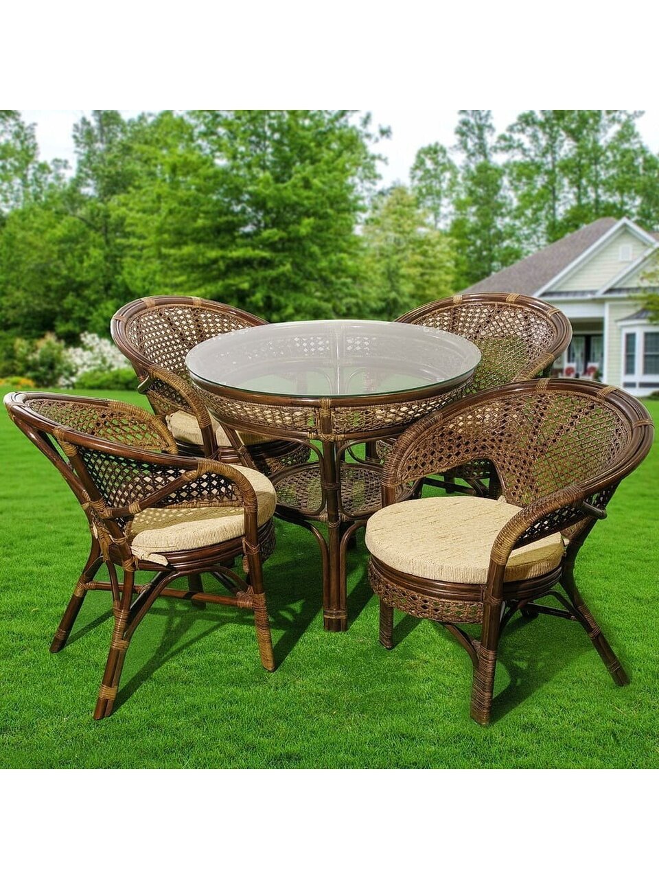 Набор садовой мебели включает небольшой столик с поверхностью из стекла, а также четыре кресла.