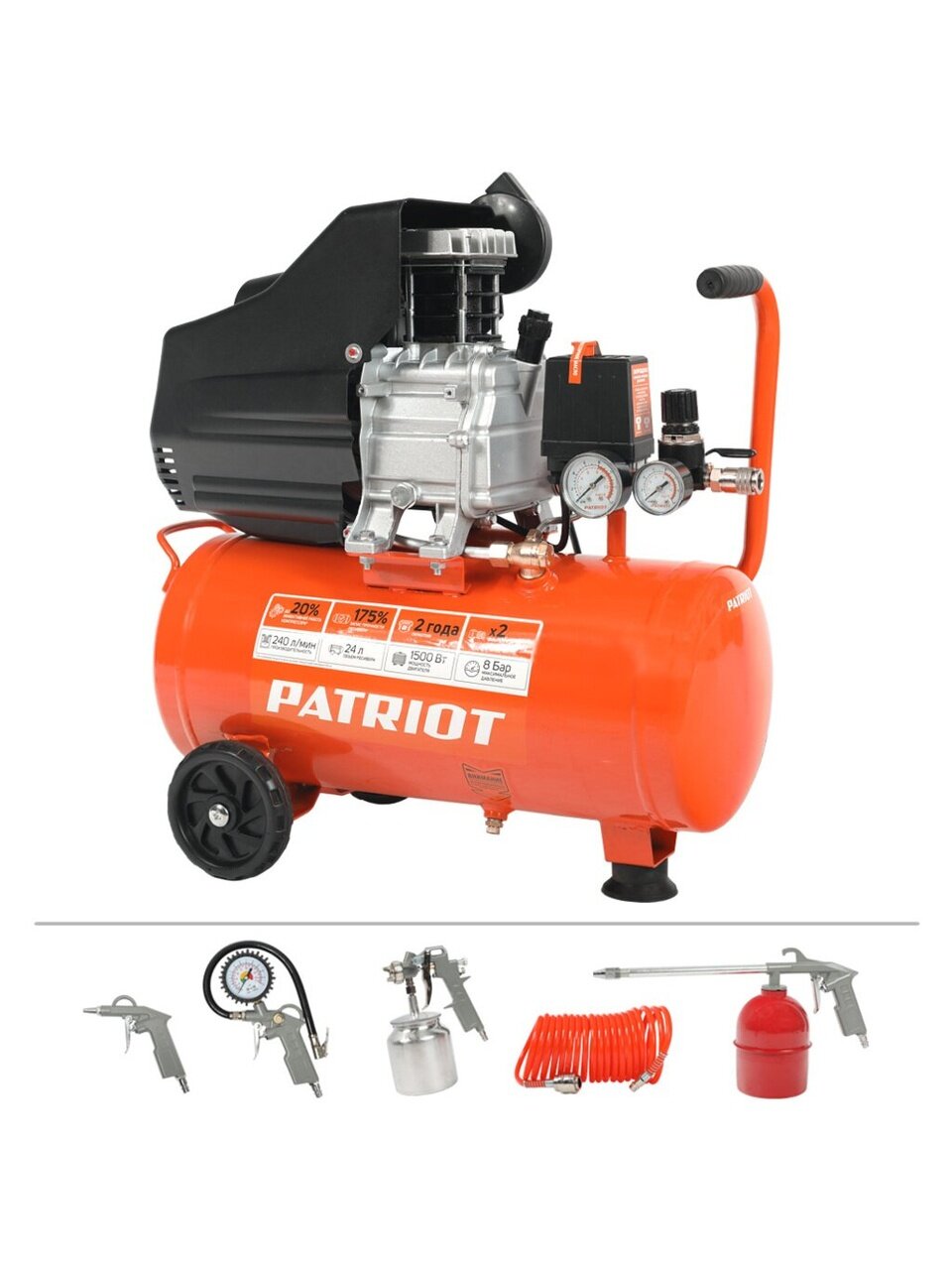 Компрессор Patriot EURO 50-260К - это универсальный агрегат, который пригодится как в профессиональной сфере, так и в быту. С помощью входящих в комплект инструментов можно выполнить широкий спектр работ, а именно: осуществить накачку шин или бытовых резиновых изделий, окрасить кузова и многое другое. Агрегат работает от однофазной электрической сети, потребляемая мощность - 1800 Вт. В комплект поставки входит спиральный шланг, краскораспылитель, пистолет для продувки, пистолет для накачки шин, пульверизатор.