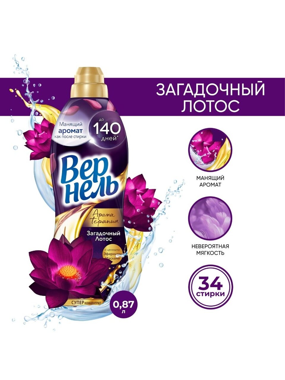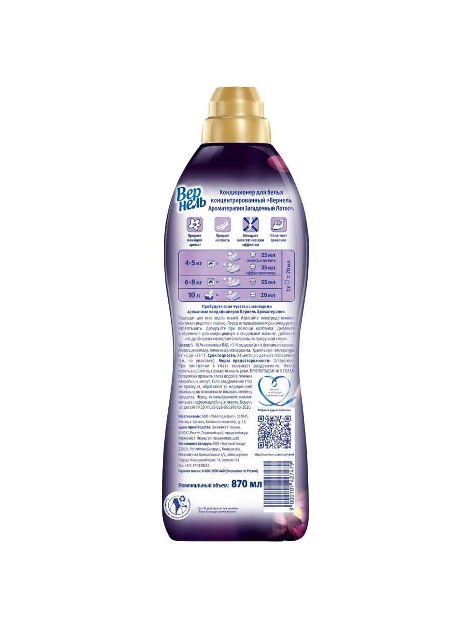 Концентрированный кондиционер для белья Вернель Ароматерапия Загадочный лотос 870 мл (34 стирки) подарит Вашему белью не только невероятную мягкость, но и магический аромат лотоса, а благодаря специальным аромакапсулам в составе кондиционер для стирки Вернель позволит наслаждаться интенсивным ароматом белья до 140 дней.