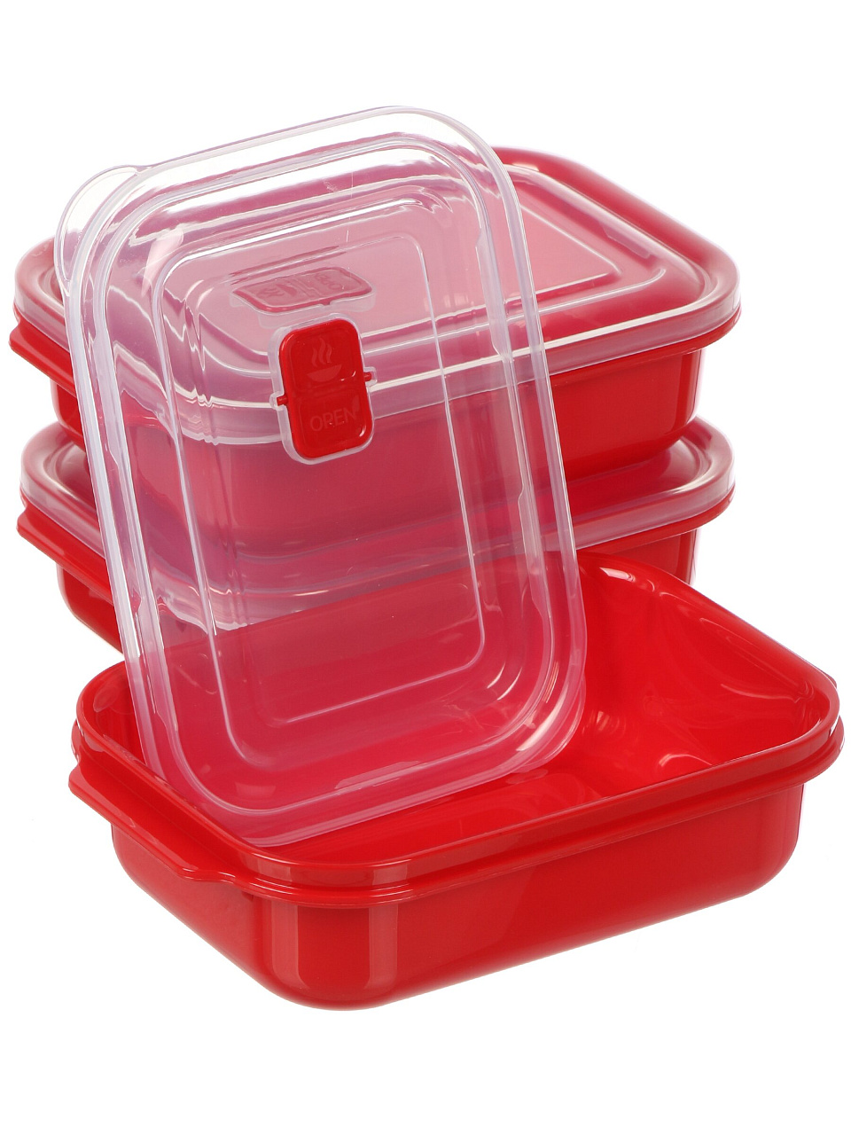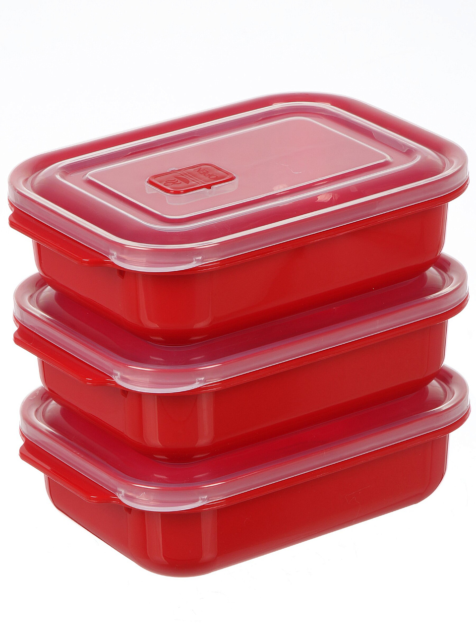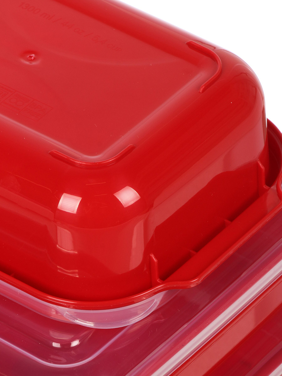 Объём одного контейнера — 1.3 литра, размеры: 22.5 см длина, 15.5 см ширина, 6.5 см высота. В наборе 3 контейнера красного цвета.