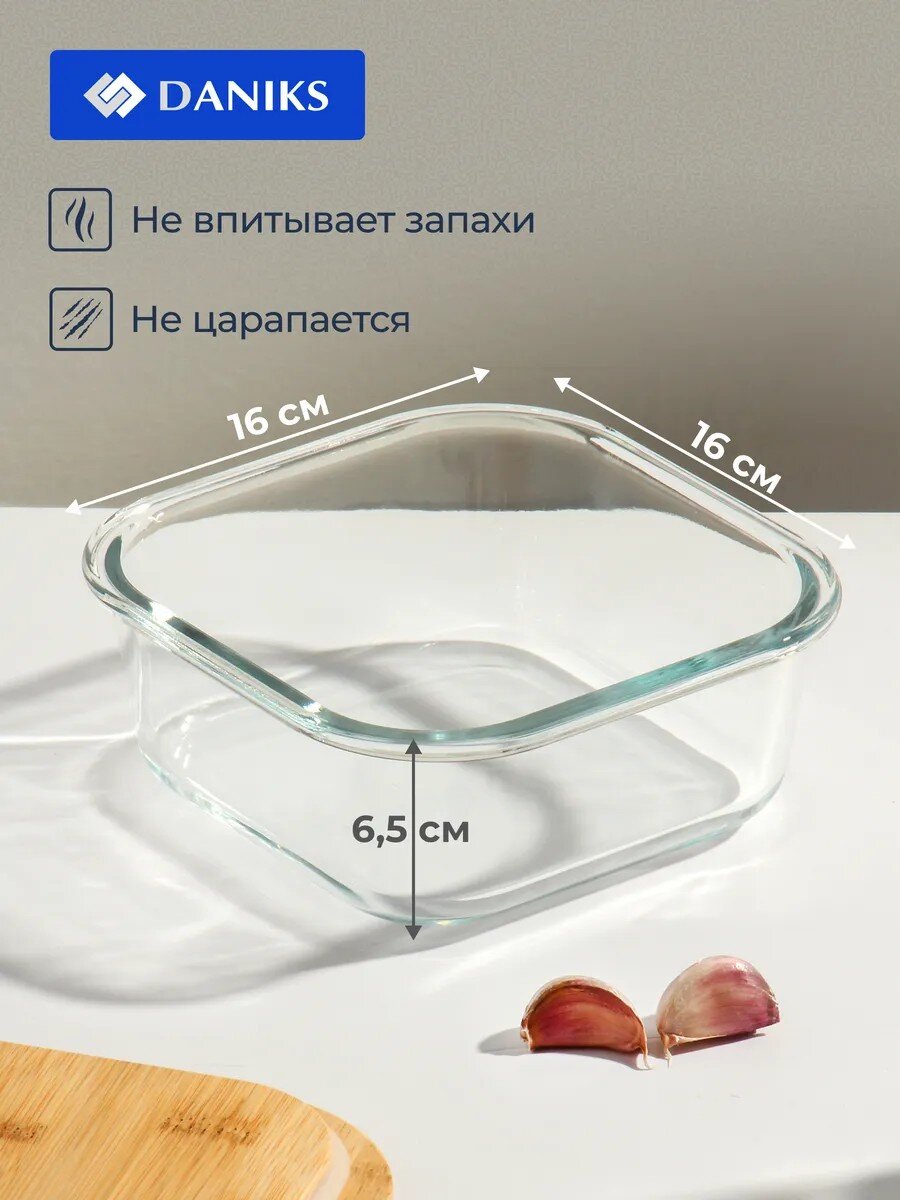 Объём контейнера — 0.8 литра, размеры: 16×16×6.5 см. Это оптимальный объём для порционного обеда, закусок или хранения остатков еды.