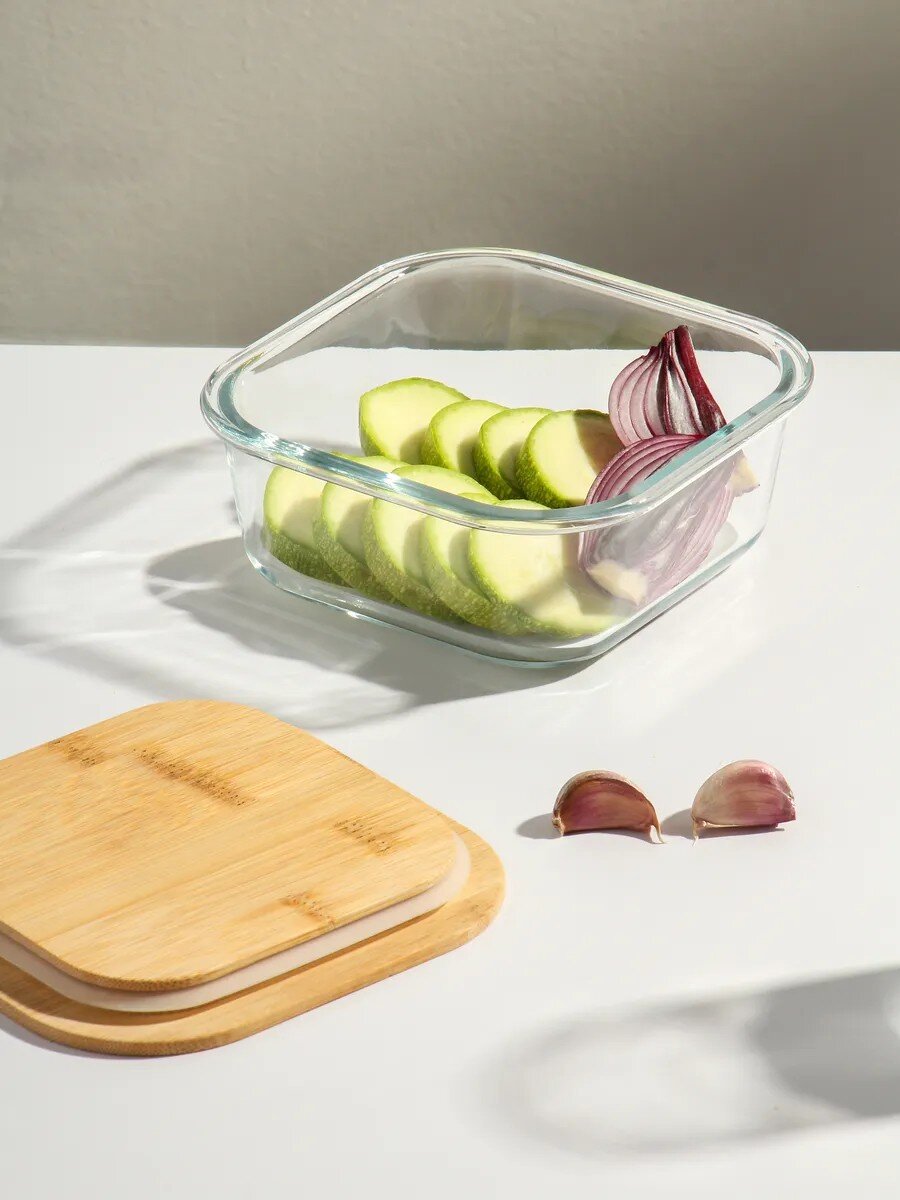 Стильный контейнер из жаропрочного стекла 0.8 л с бамбуковой крышкой: храните и разогревайте еду безопасно, экологично и удобно — идеальный выбор для дома и дачи.