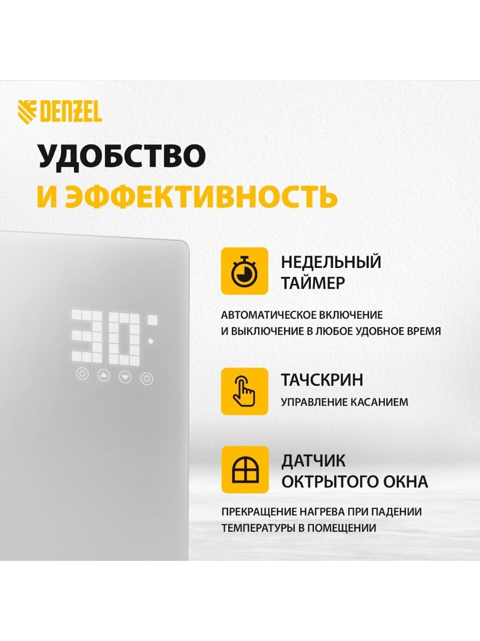 Вы можете приобрести «Конвектор Denzel, OptiPrime-1500, напольный/настенный, 1.5 кВт, 20 м2, Wi-Fi, тачскрин» и другие товары в нашем интернет-магазине в Воронеже по низким ценам и с бесплатным самовывозом.