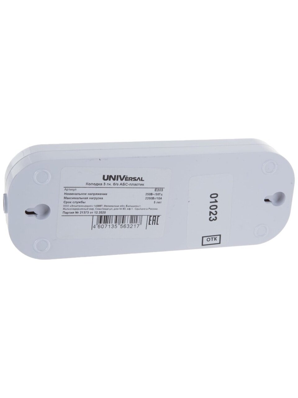 Вы можете приобрести «Корпус удлинителя 3 гнезда, 3 полюса, без заземления, 10 А, 2.2 кВт, белый, UNIVersal, E203» и другие товары в нашем интернет-магазине в Коврове по низким ценам и с бесплатным самовывозом.