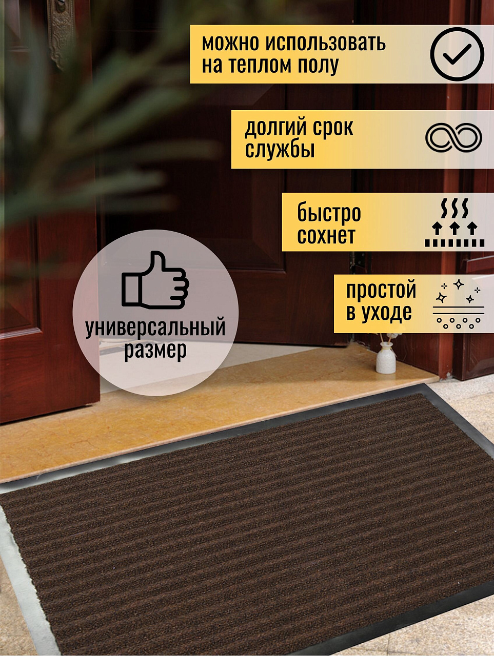 Коврик для прихожей Floor Mat отлично впитает влагу и очистит Вашу обувь от грязи и пыли, защитит пол в прихожей и избавит от лишней уборки. Коврик изготовлен из суперстойкого волокна - 100% полипропилена на резиновой водоотталкивающей основе, что обеспечивает высокую износостойкость и длительную эксплуатацию внутри и вне помещений.
