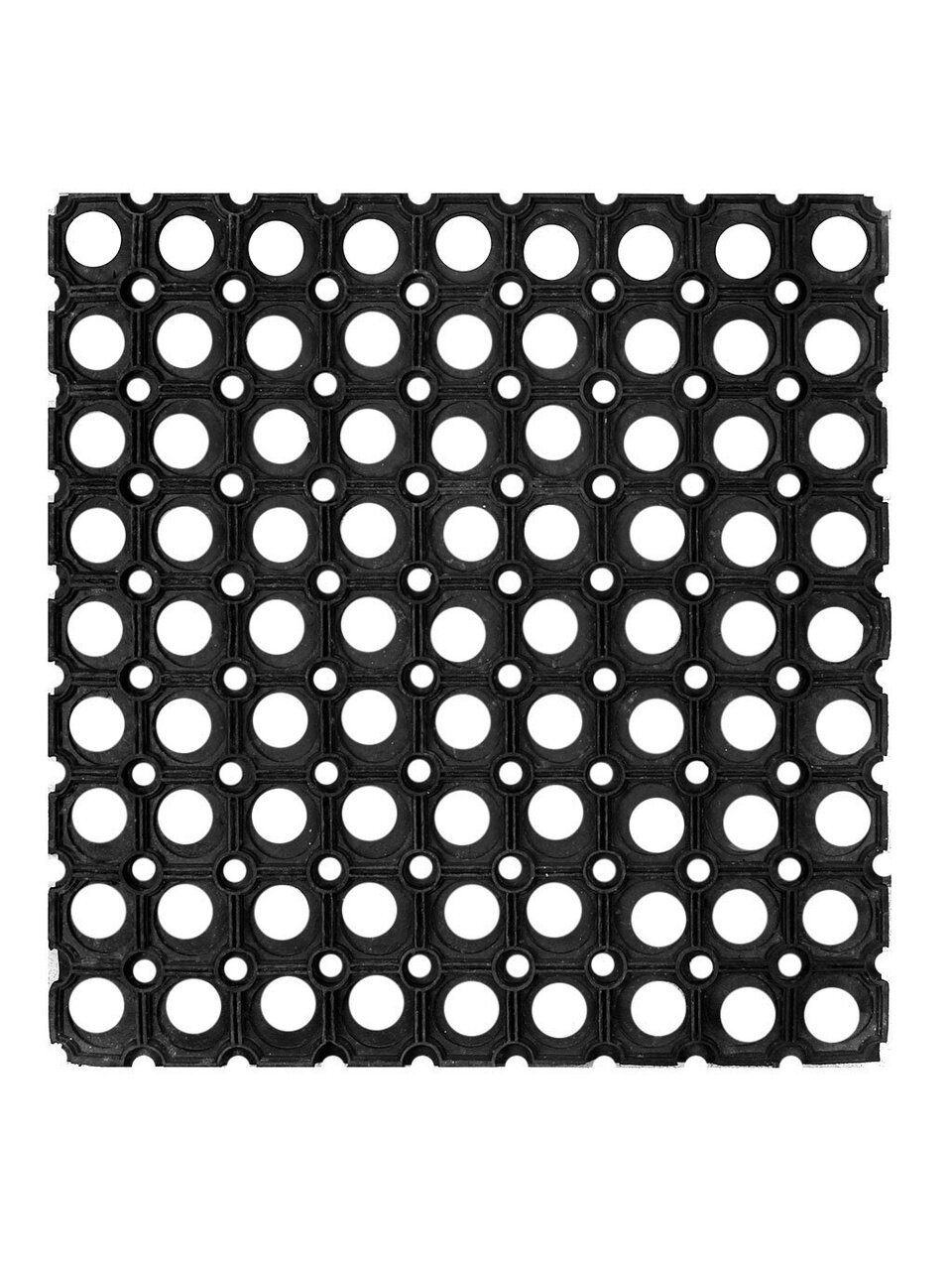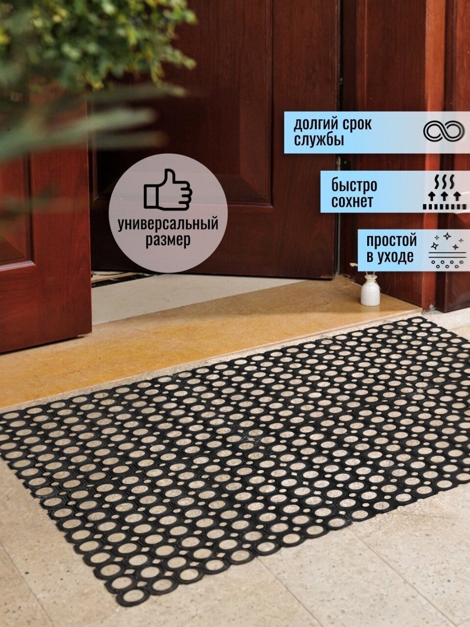 Придверный коврик изготовлен из прочной и долговечной резины. Конструкция коврика имеет специальные ребра, которые помогают более эффективно удалять грязь с обуви, а отверстия в конструкции удаляют излишки воды.