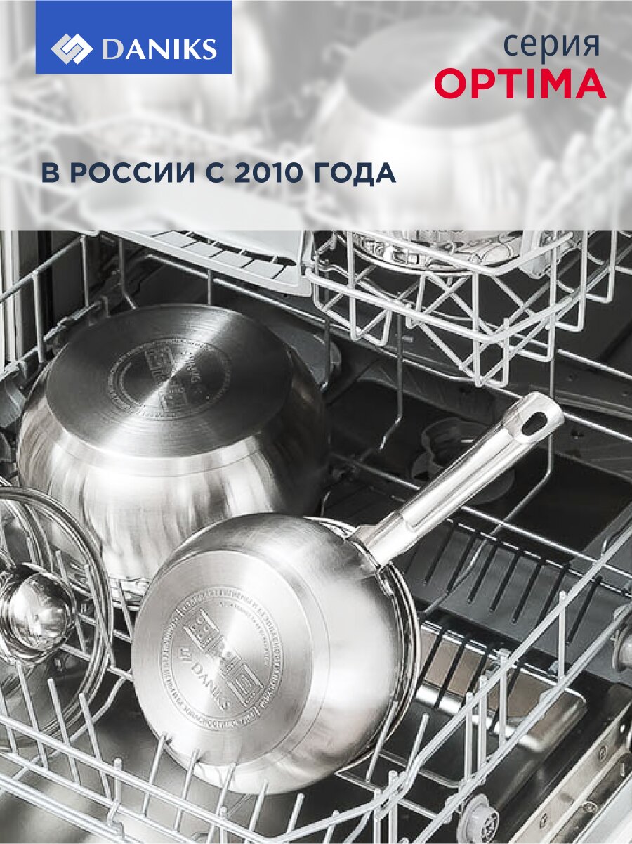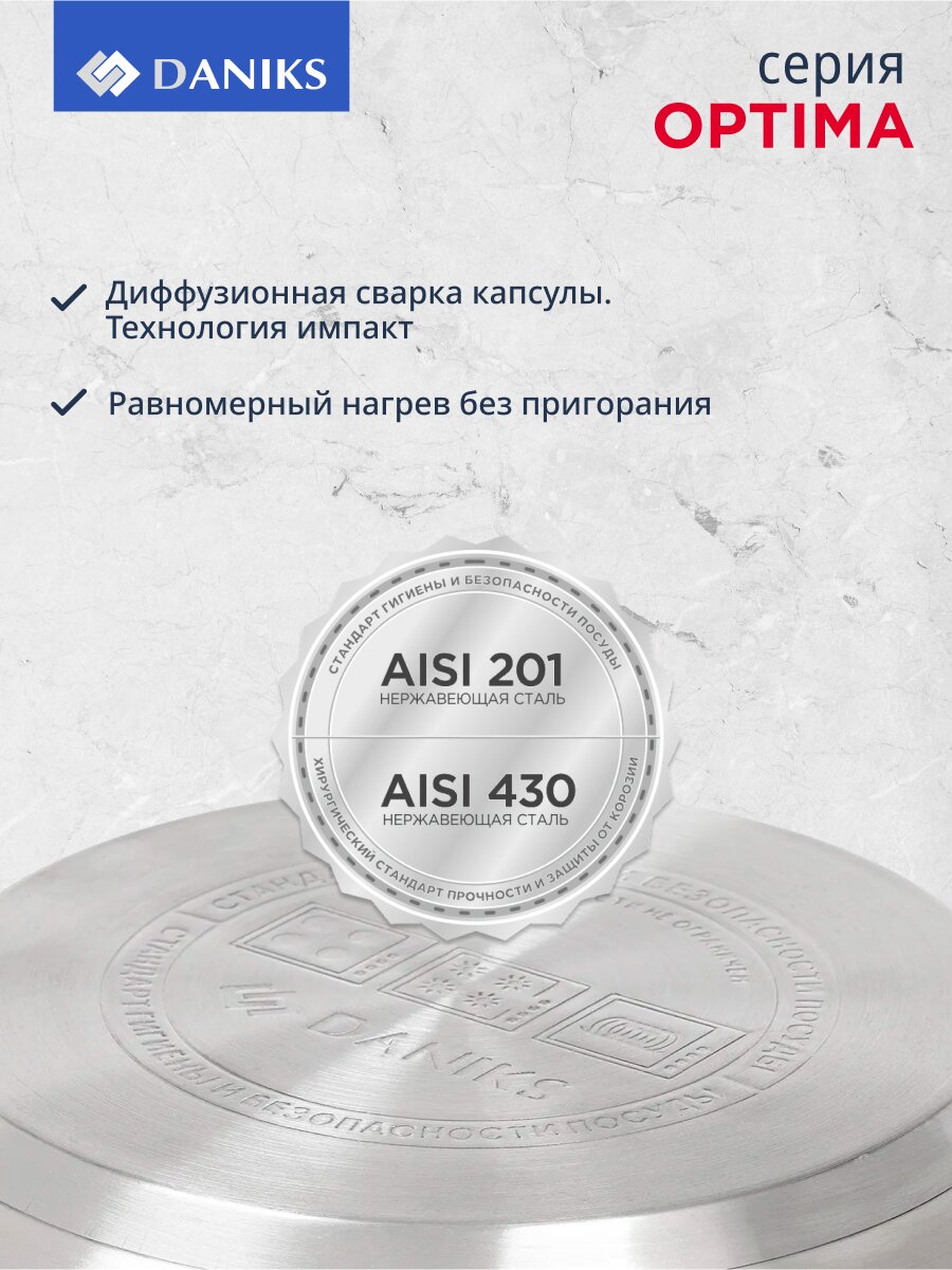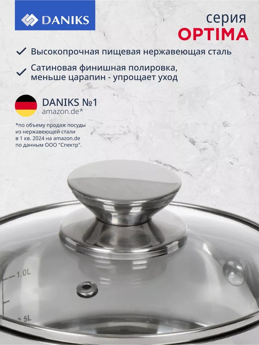 Ковшик посуды Daniks Оптима выполнен из высококачественной нержавеющей стали. Крышка из прозрачного стекла позволяют контролировать процесс приготовления пищи. Металлическая ручка прикреплена к корпусу методом клепочной фиксации, удобна, прочна и не нагревается при использовании посуды.