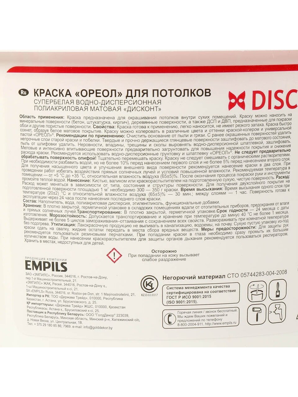 Вы можете приобрести «Краска водно-дисперсионная, Ореол, Дисконт, полиакриловая, для потолков, матовая, белоснежная, 3 кг» и другие товары в нашем интернет-магазине в Железногорске по низким ценам и с бесплатным самовывозом.