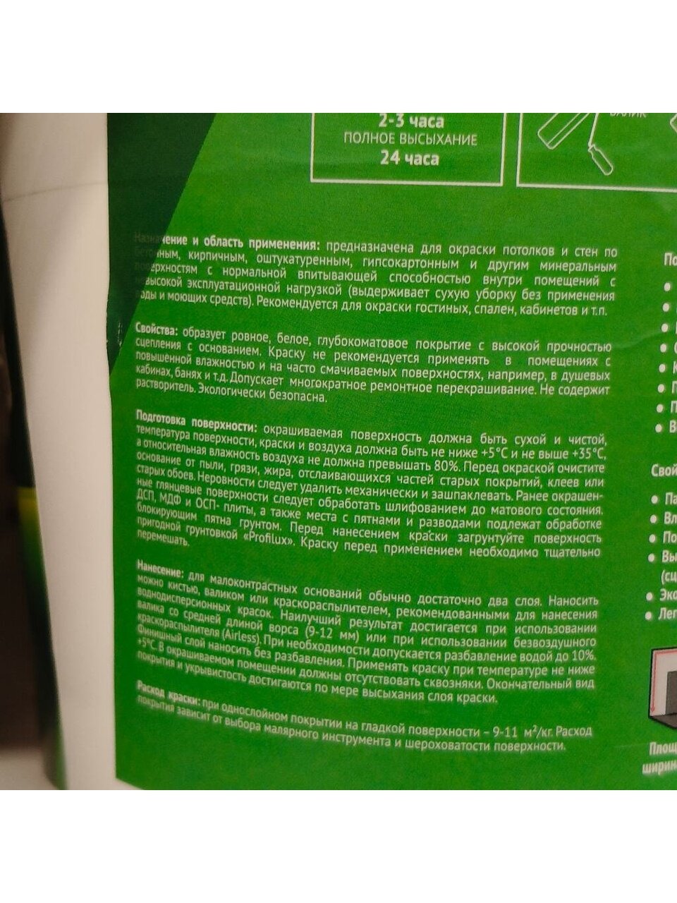 Применяется для окраски стен и потолков в жилых и общественных зданиях, помещениях, не подвергающихся сильным эксплуатационным нагрузкам. Краска применяется на все виды минеральных оснований, включая асбестоцемент, газобетон, гипсовые штукатурки, гипсокартонные плиты, на старые, но еще прочные лакокрасочные покрытия.
