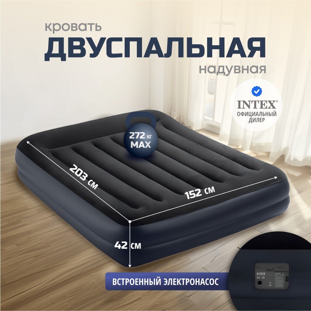 Кровать надувная Intex, 203х152х42 см, 64124ND, насос встроенный, электрический, флокированная, с ремкомплектом, 272 кг