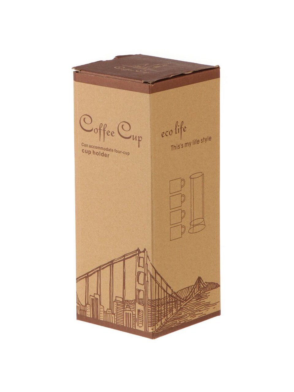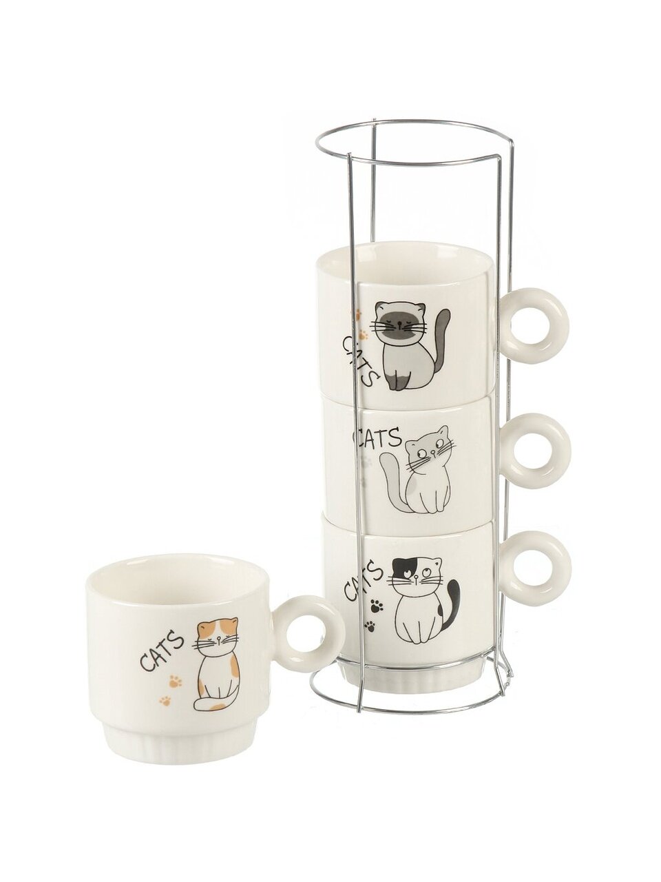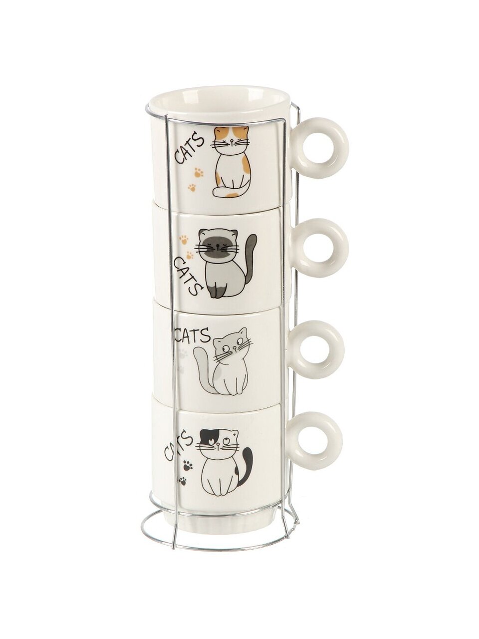 Объём каждой кружки — 250 мл, материал — керамика; подставка выполнена из металла, набор рассчитан на 4 персоны.