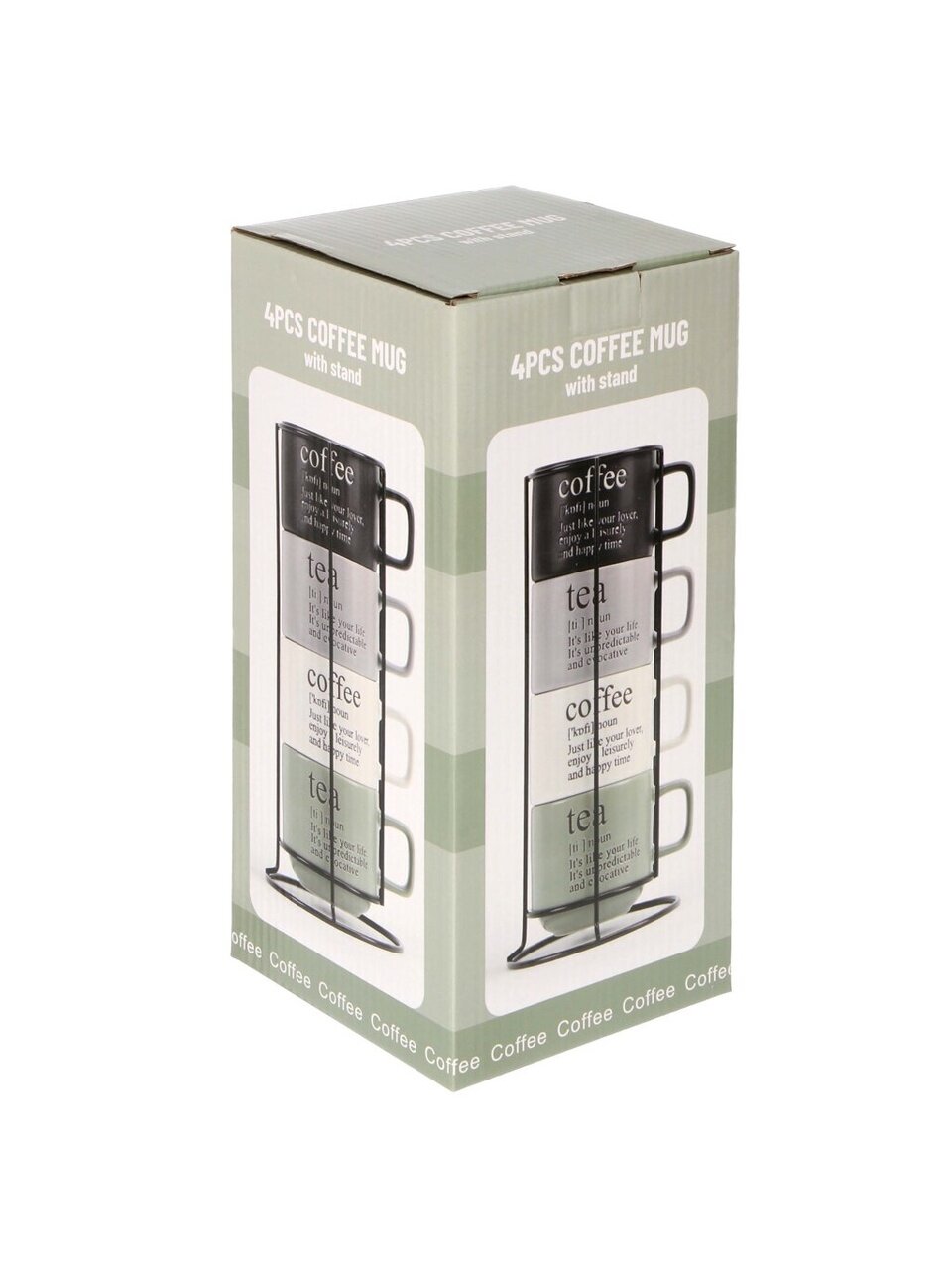 В наборе 4 кружки, каждая объёмом 250 мл. В комплекте прилагается металлическая подставка для компактного хранения.
