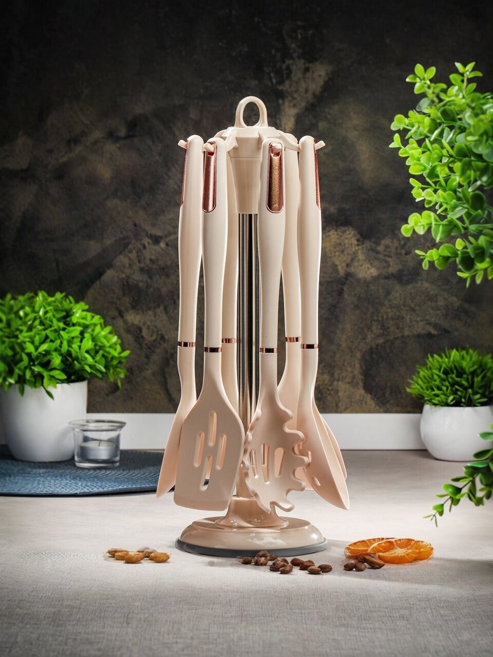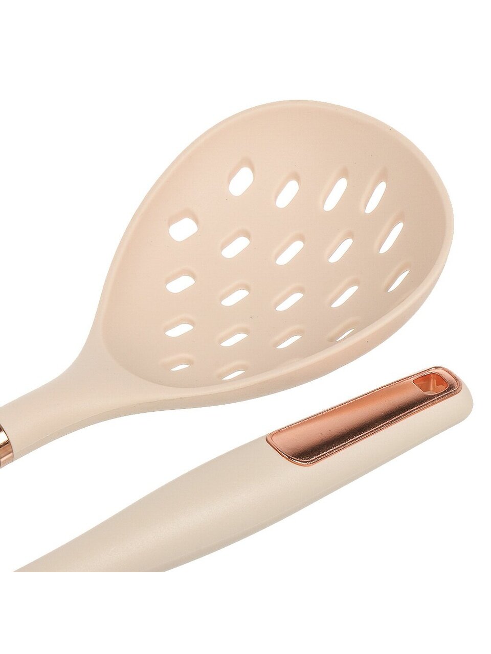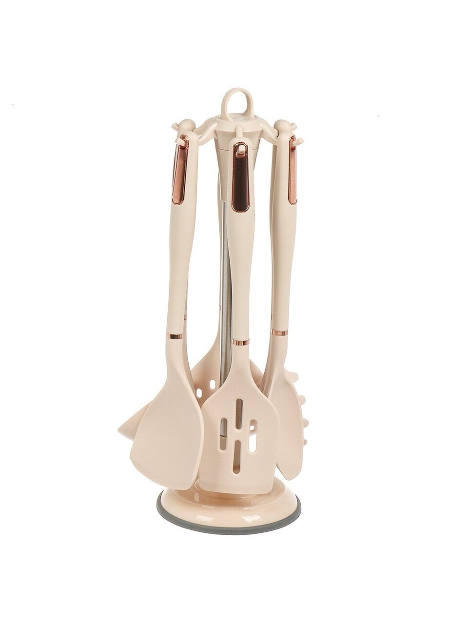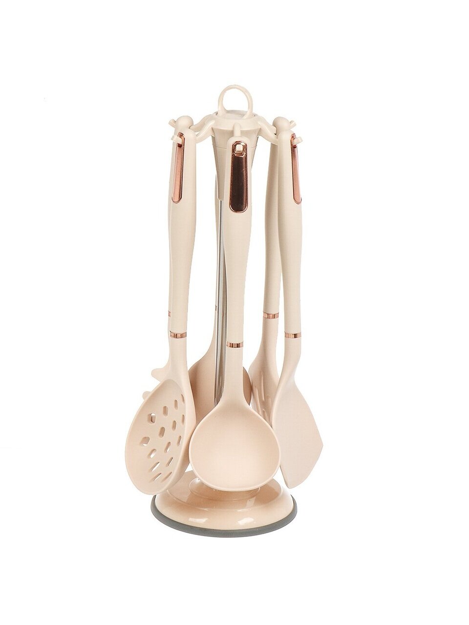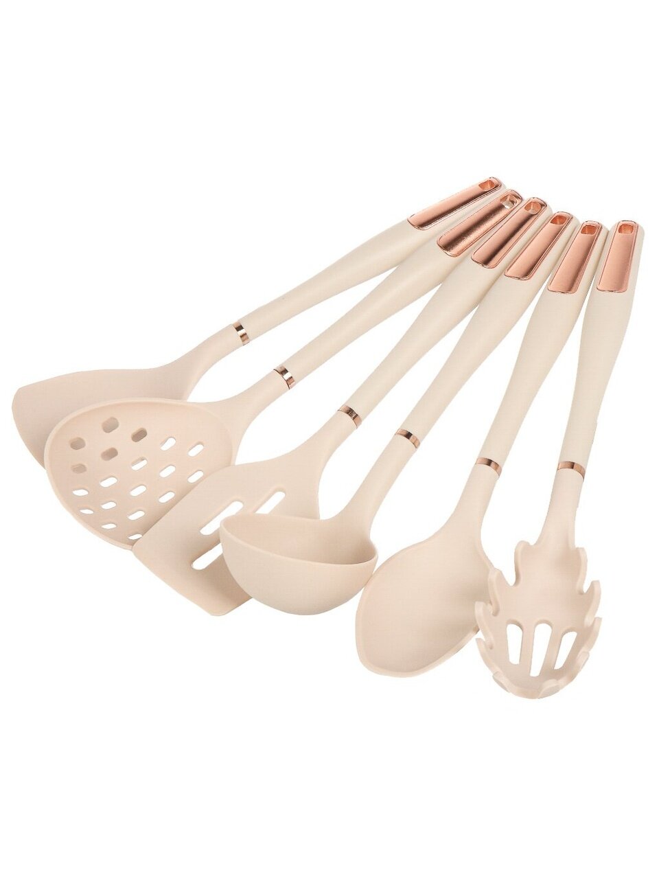 - Состав набора: половник, шумовка, ложка поварская, лопатка, лопатка с прорезями, ложка для спагетти, подставка.