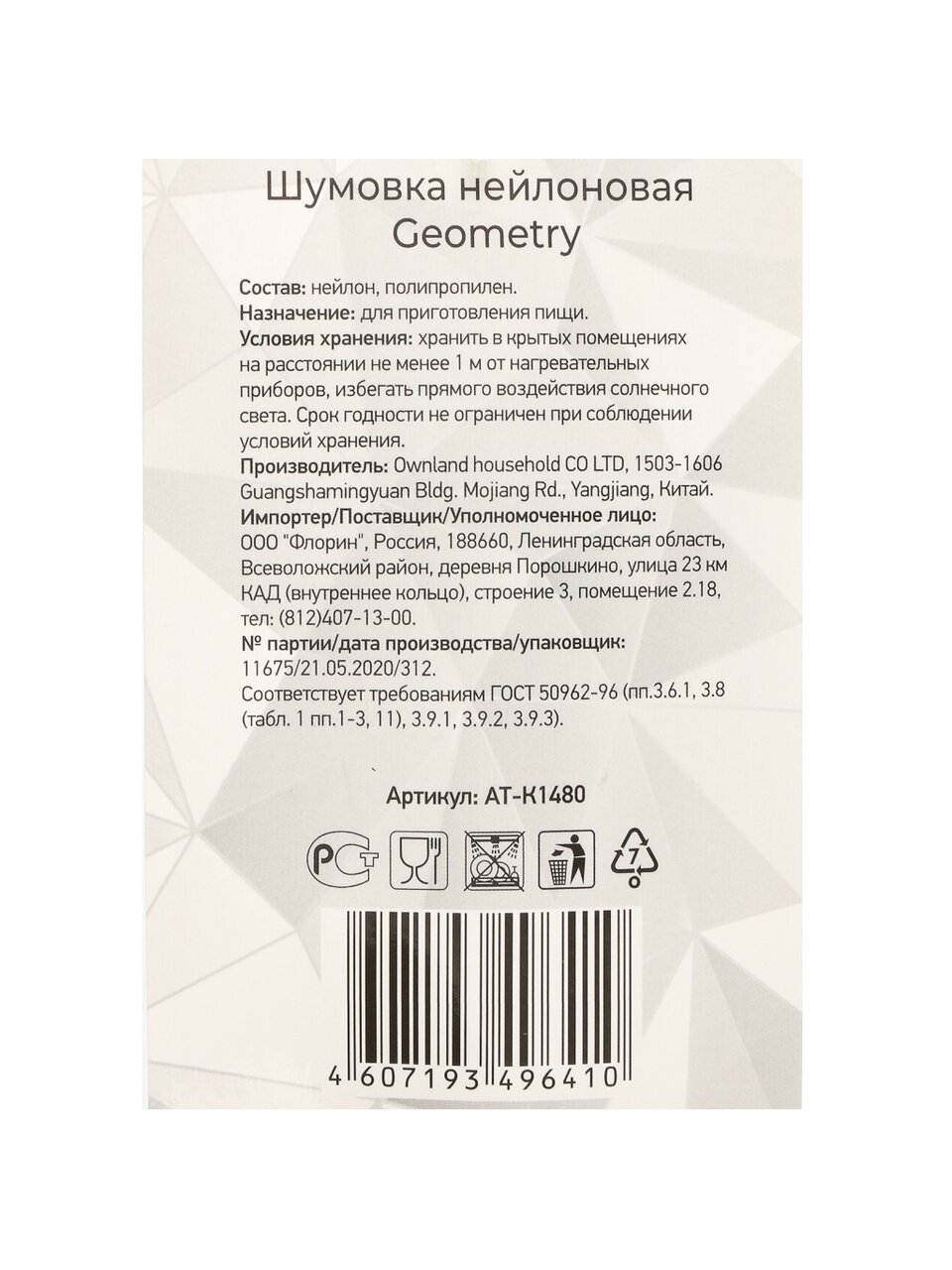 Вы можете приобрести «Шумовка нейлон, 36 см, навеска, Atmosphere, Geometry, AT-K1480» и другие товары в нашем интернет-магазине в Орле по низким ценам и с бесплатным самовывозом.