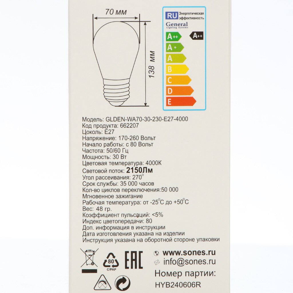 Обратите внимание на мощность (30 Вт), тип цоколя (E27), световой поток (2150 лм) и цветовую температуру (4000 К). Эта модель подходит для большинства бытовых светильников.