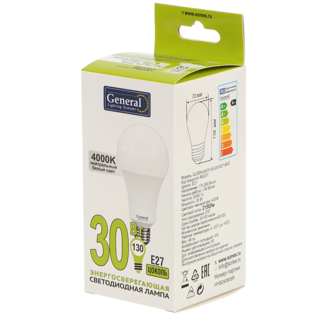 Вы можете приобрести «Лампа светодиодная E27, 30 Вт, 230 В, груша, 4000 К, нейтральный белый свет, General Lighting Systems, GLDEN, 662207» и другие товары в нашем интернет-магазине в Ставрополе по низким ценам и с бесплатным самовывозом.