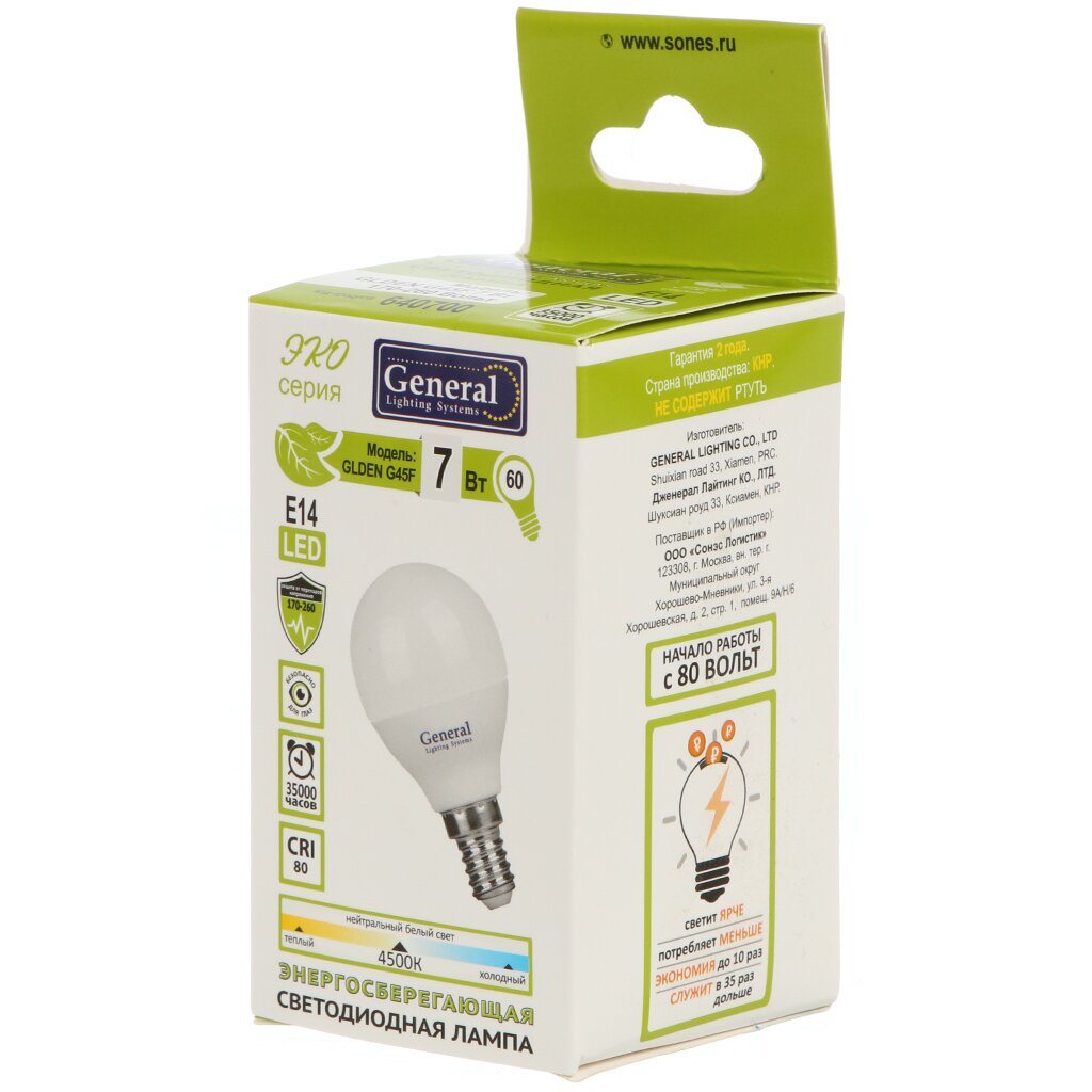 Вы можете приобрести «Лампа светодиодная E14, 7 Вт, 230 В, шар, 4500 К, нейтральный белый свет, General Lighting Systems, GLDEN, 640700» и другие товары в нашем интернет-магазине в Ставрополе по низким ценам и с бесплатным самовывозом.