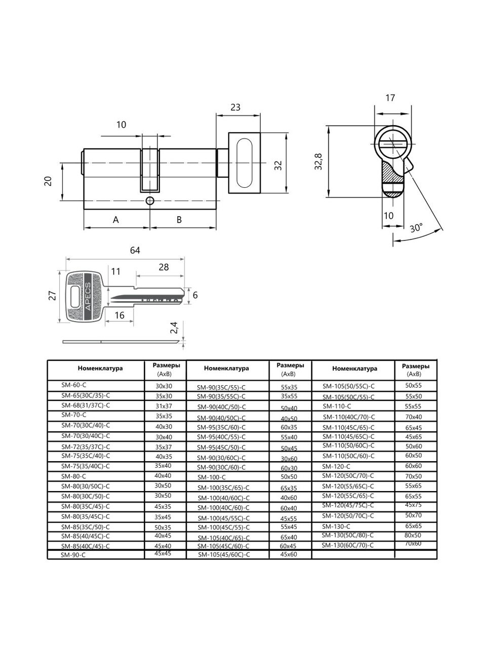 - Цилиндровые механизмы Apecs серии SM - одни из немногих существующих на рынке России цилиндров, которые прошли испытания и сертификацию в России. Серия SM предназначена для установки во входные двери и обеспечивает уровень защиты, соответствующий 2 классу (из 4 возможных) по российскому ГОСТу.