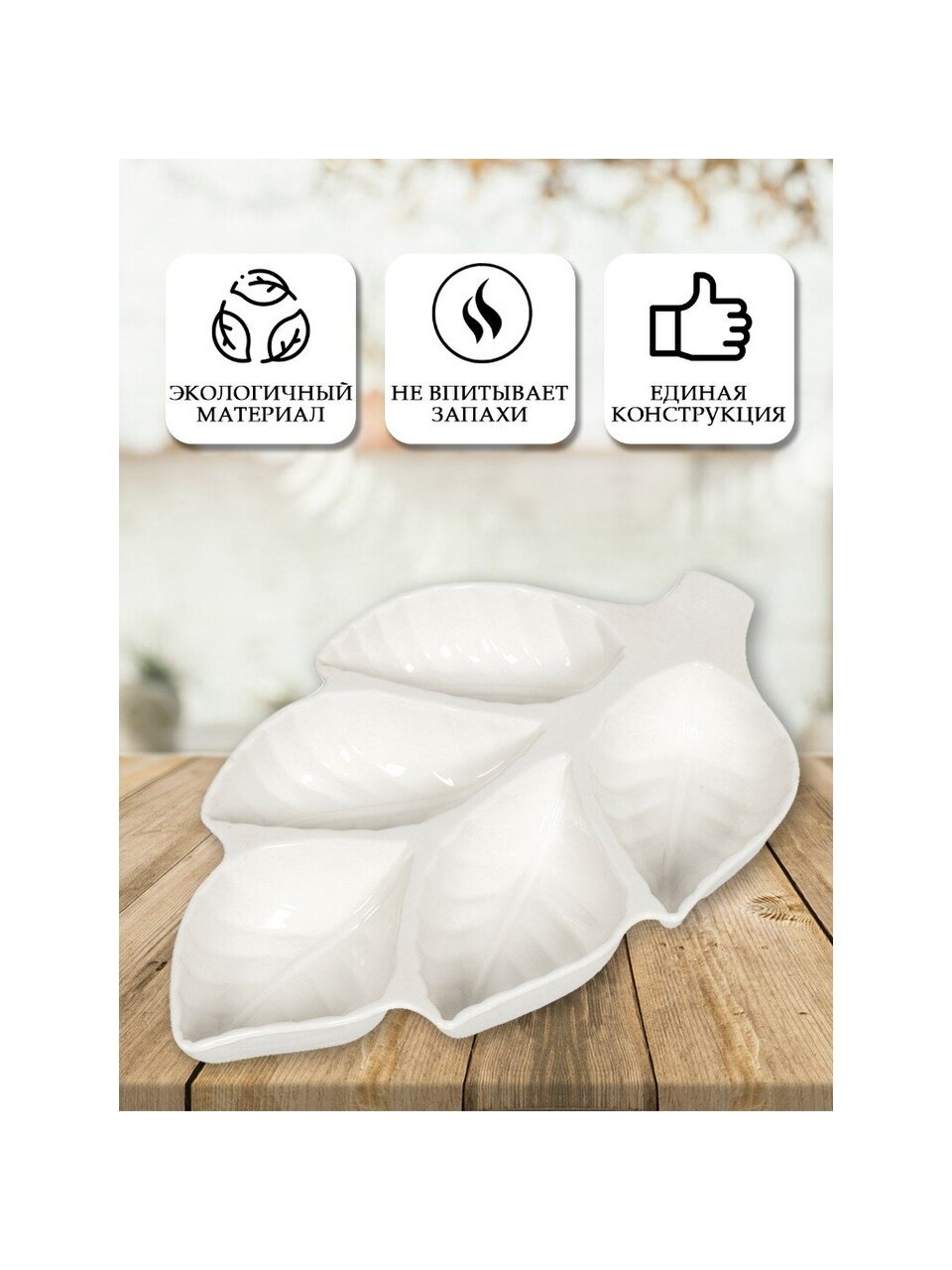 Менажница «Листок» цельная на 5 секции выполнена из высококачественного белого фарфора. Благодаря необычной форме и множеству секции в менажнице идеально сервировать закуски к столу. В серии фарфоровой посуды представлен широкий ассортимент товаров для сервировки стола, которые несомненно впишутся в любой интерьер благодаря лаконичному дизайну, натуральным материалам и высокой функциональности. Такому подарку будет рада любая хозяйка!