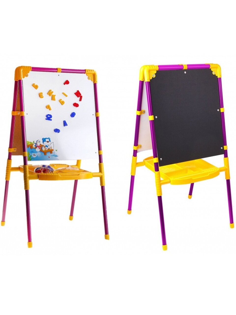 Мольберт предназначен для обучения и развития творческих способностей детей возрастом старше 3 лет. Мольберт имеет две рабочие поверхности, одна сторона предназначена для рисования мелом, а вторая — маркерами для досок, а также для размещения магнитных фигур и алфавита.