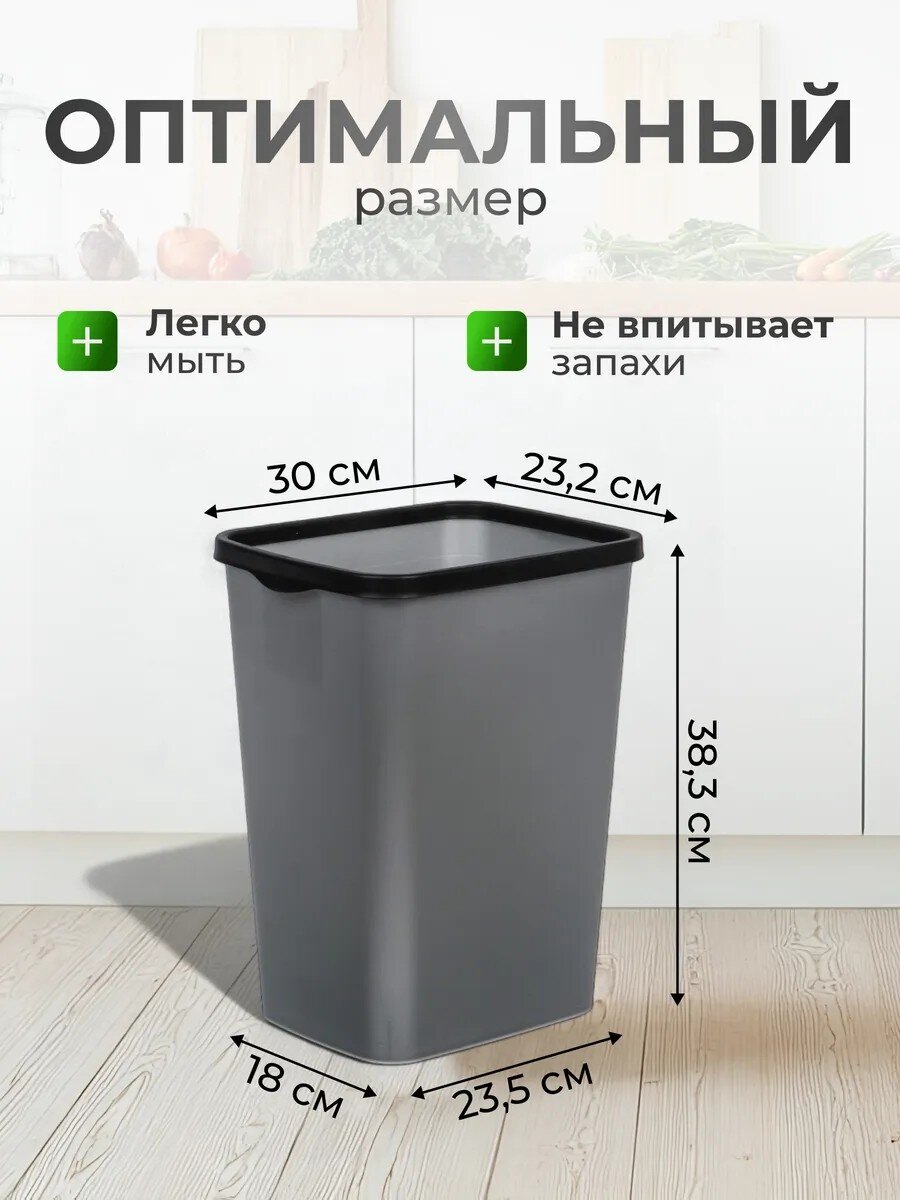 - Оптимальный размер бака пригодится для различного мусора и пищевых отходов и подойдет для кухни, туалета или ванной, будет уместно у туалетного столика или в рабочем помещении, офисе.
