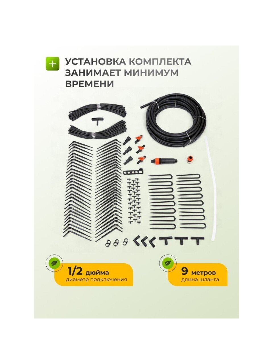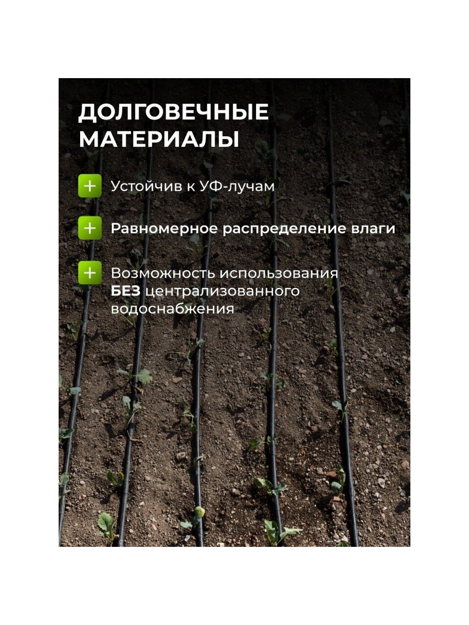 Установка комплекта занимает минимум времени и не требует специальных навыков. Диаметр подключения 1/2 дюйма позволяет легко интегрировать систему в существующую инфраструктуру участка. Максимальное давление 0,2 бар обеспечивает мягкую и деликатную подачу воды, предотвращая переувлажнение корней и минимизируя расход воды. Такой подход не только способствует экономии ресурсов, но и поддерживает оптимальные условия для выращивания овощей, ягод и декоративных культур.