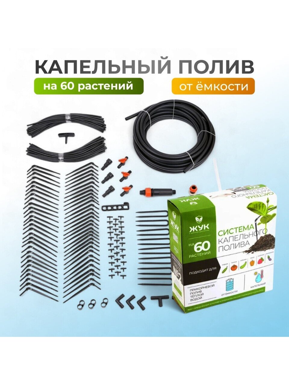 Набор для капельного полива от емкости на 60 растений Жук — эффективное решение для автоматизации ухода за растениями в теплице, на даче, в саду или на грядках. Система капельного полива от бренда Жук обеспечивает точную и равномерную подачу воды каждому растению, что способствует их активному росту и обильному урожаю. Благодаря простоте установки и эксплуатации, комплект идеально подходит для полива клубники, огурцов, помидоров и других культур на участке площадью до 18 м².