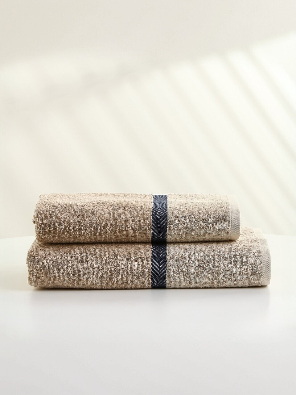 Выбирая этот комплект, вы получаете долговечность, эстетичный дизайн (бежевый с синим кантованием), а также универсальность — полотенца легко вписываются в любой интерьер. Закажите сейчас, чтобы получить выгодную цену и быструю доставку по России.