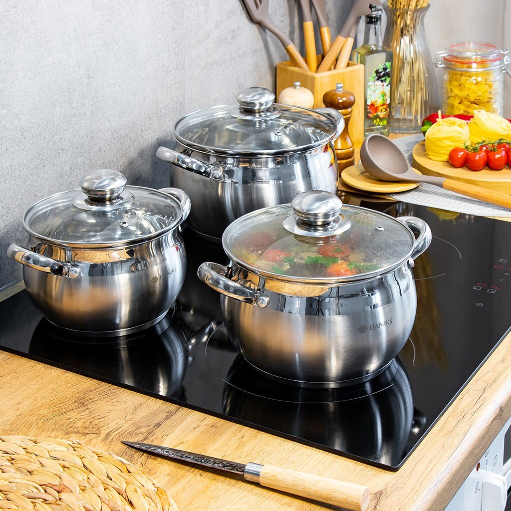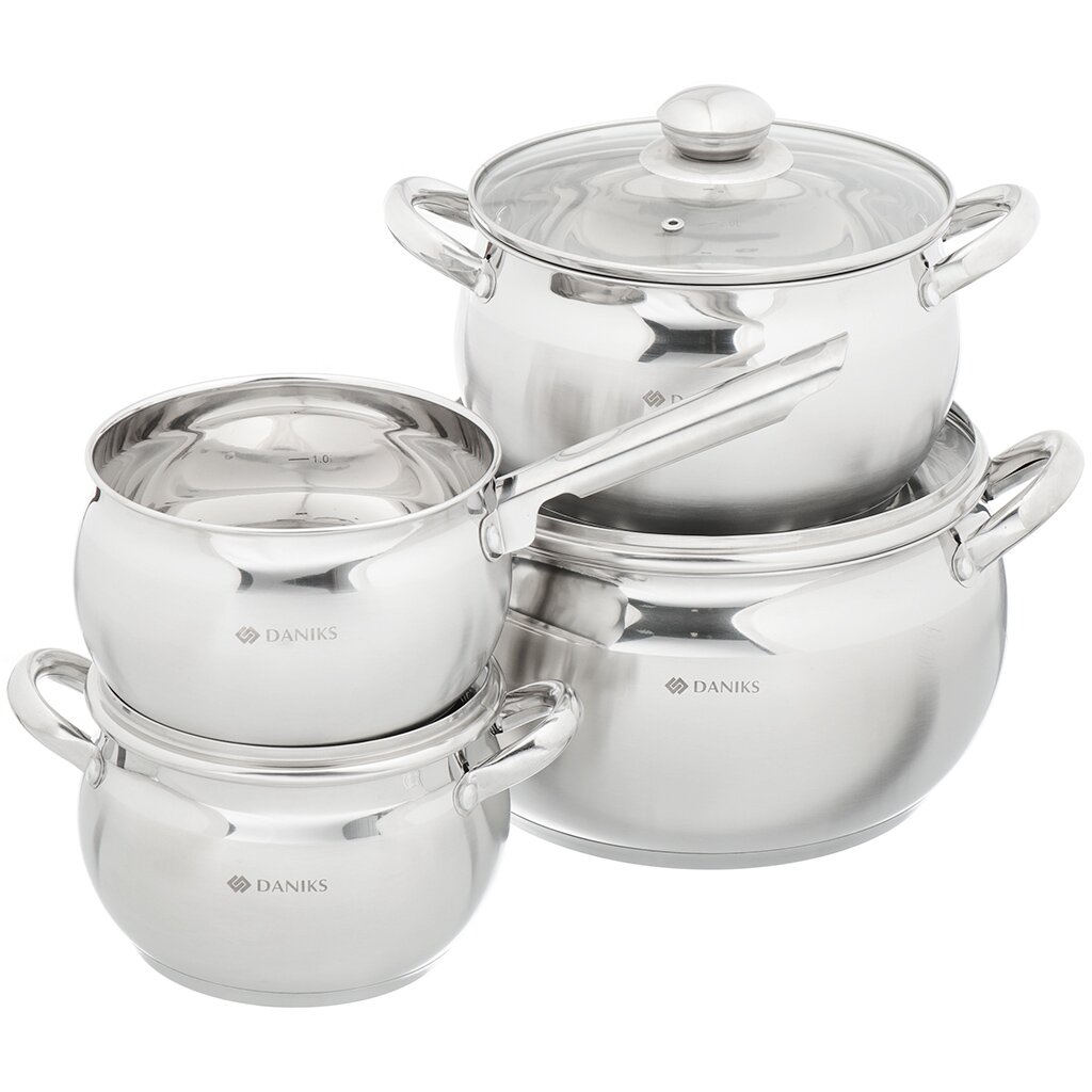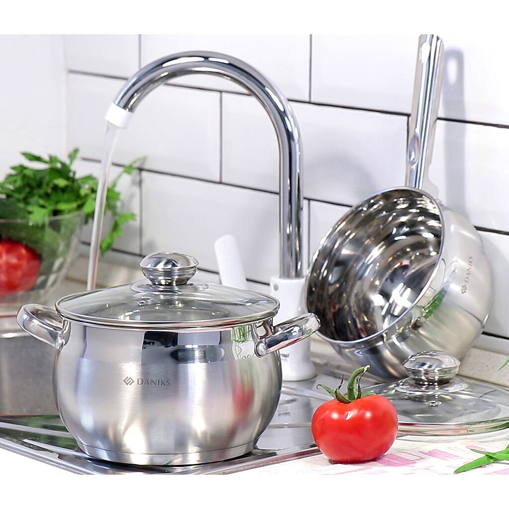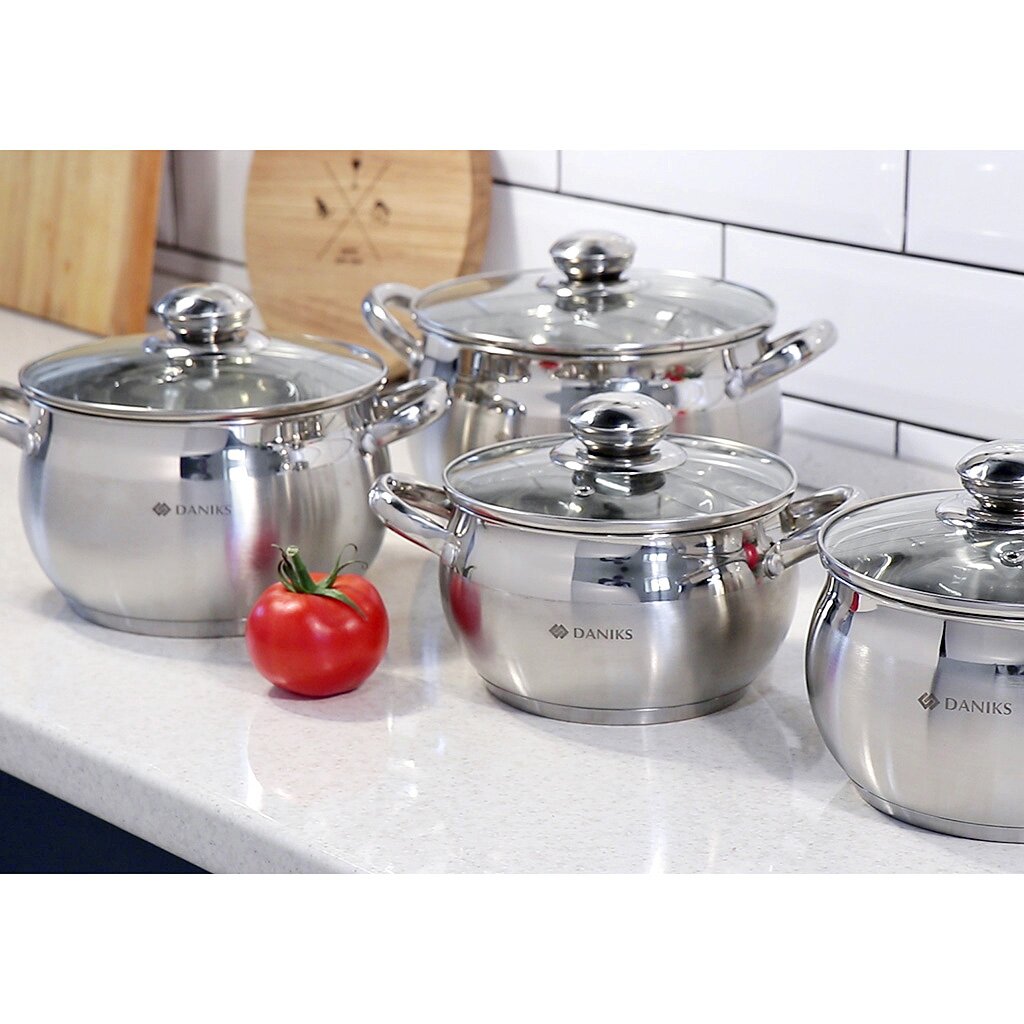 Набор посуды Daniks Классика SD-6-7 выполнен из высококачественной нержавеющей стали. Крышки из прозрачного стекла позволяют контролировать процесс приготовления пищи. Металлические ручки удобны, прочны и не нагреваются при использовании посуды.