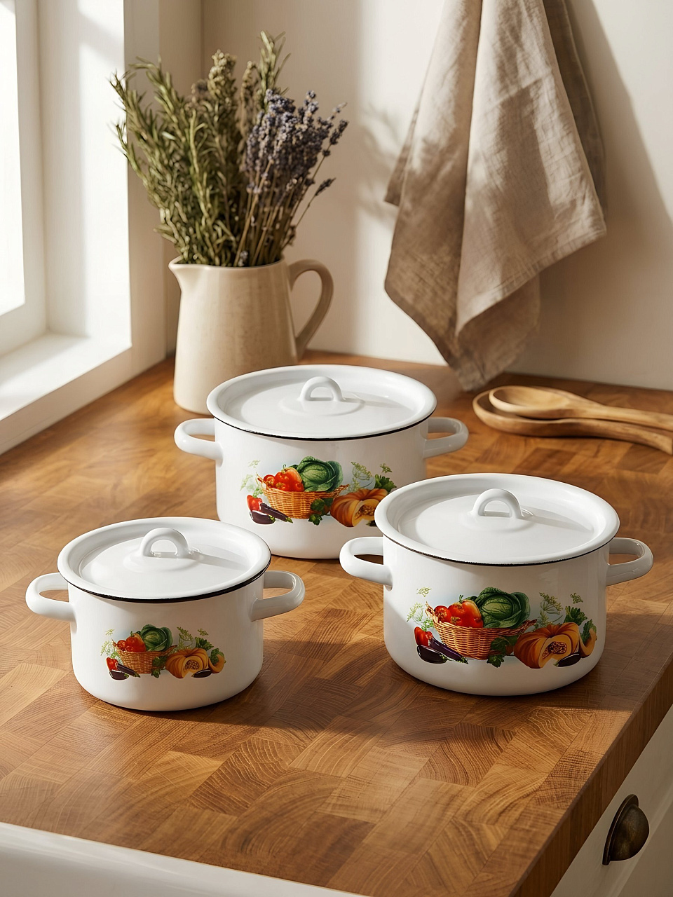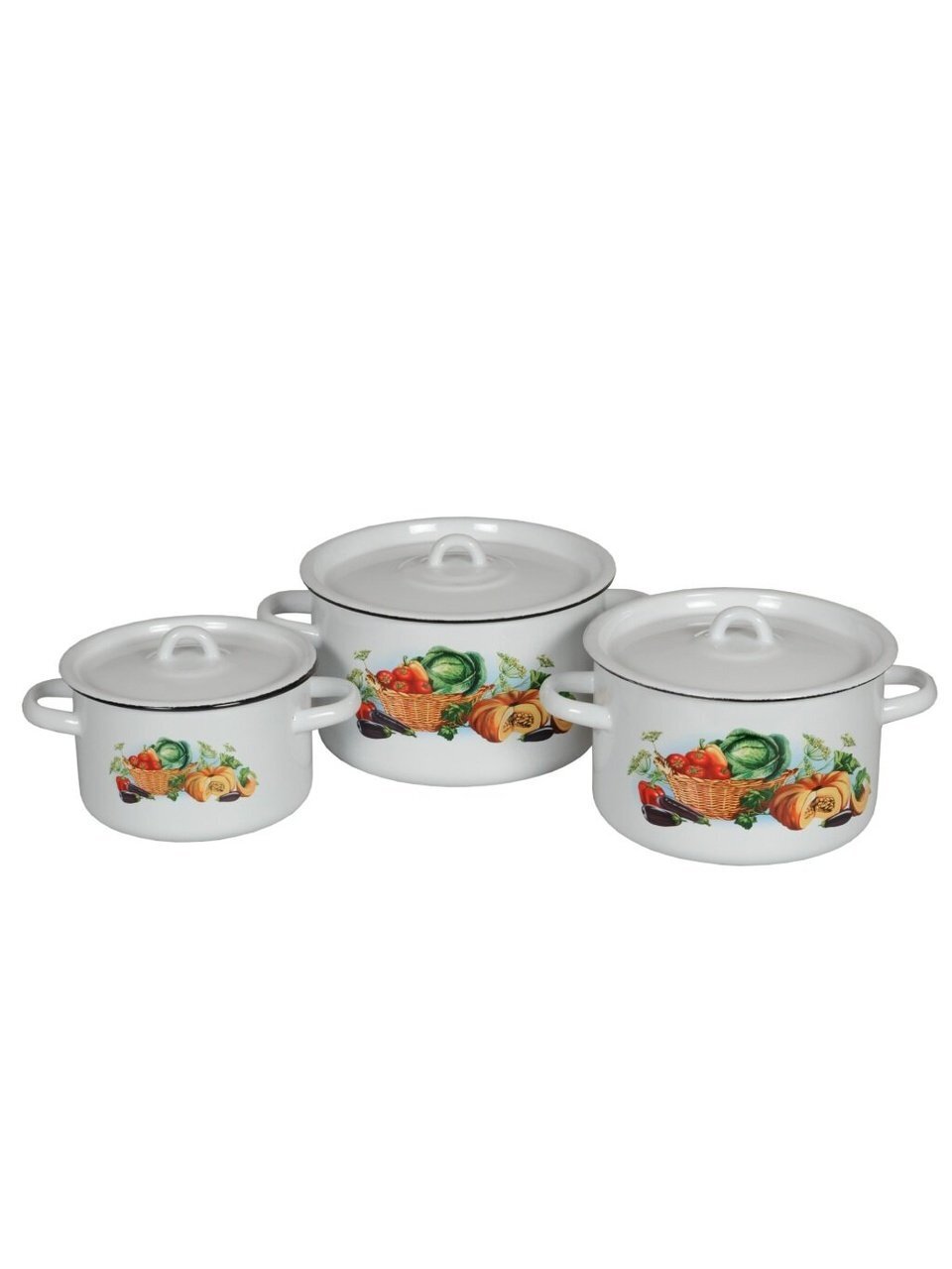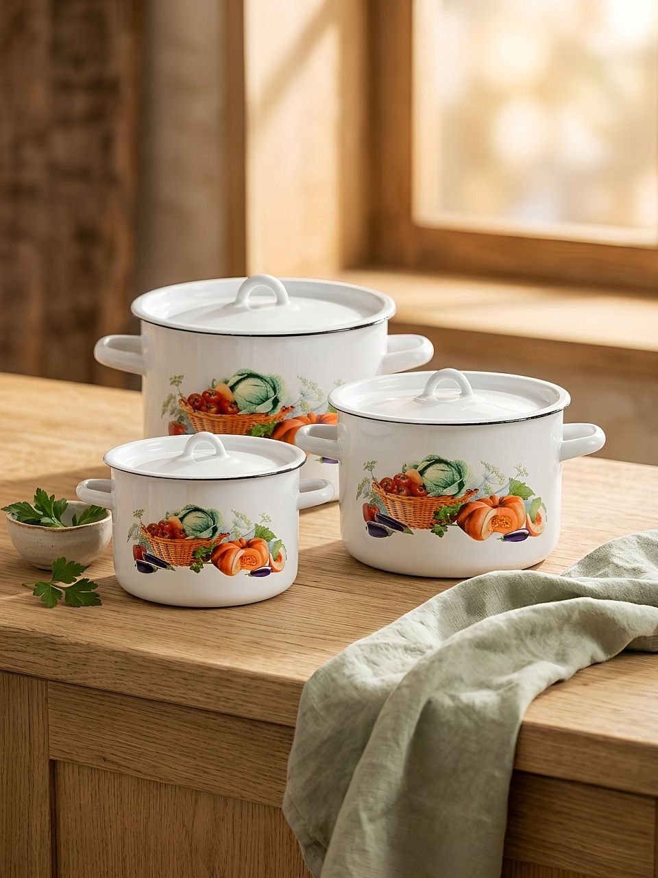 Набор эмалированных кастрюль СтальЭмаль Урожай 1.5/2.9/4.5 л — универсальное решение для кухни и дачи: подходит для индукционных плит, долговечен, выгодная цена.