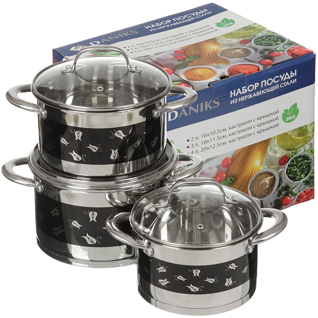 Набор посуды из нержавеющей стали Daniks Декор M-327B (кастрюля 2+3+4 л), 3 предмета