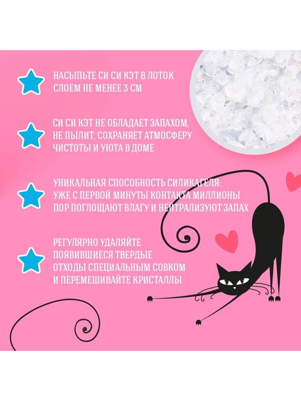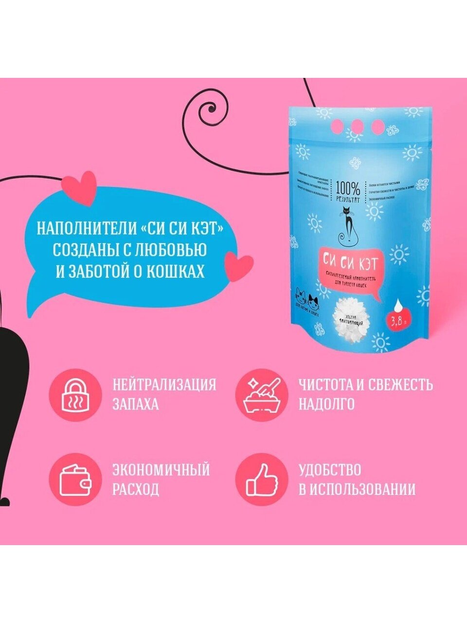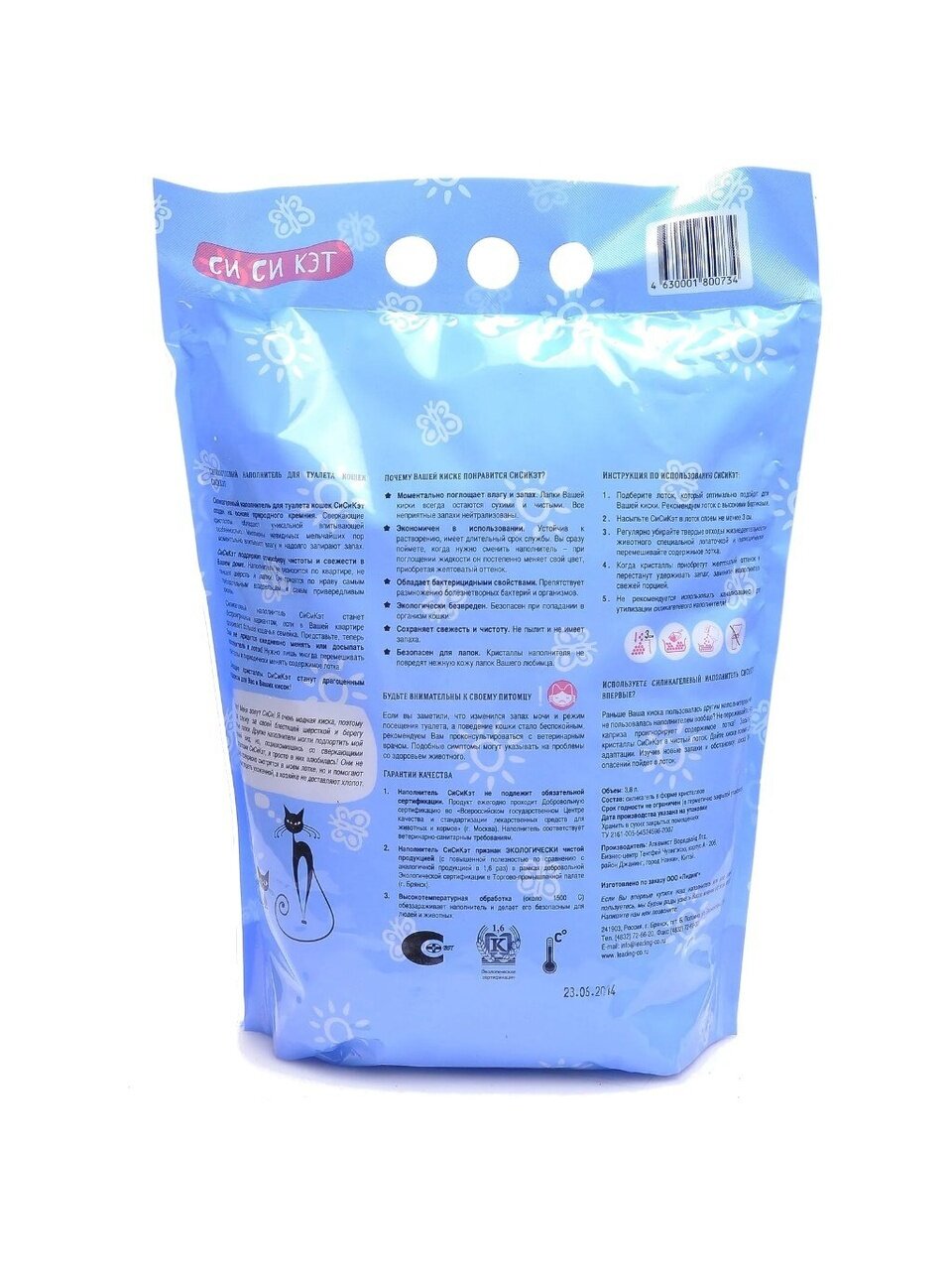 Силикагелевый наполнитель Си Си Кэт создан на основе природного кремния. Сверкающие кристаллы обладают уникальной впитывающей особенностью. Миллионы невидимых мельчайших пор моментально впитывают влагу и надолго запирают запах. Си Си Кэт поддержит атмосферу чистоты и свежести в Вашем доме. Наполнитель не разносится по квартире, не пачкает шерсть и лапки. Он придется по нраву самым требовательным владельцам и самым привередливым питомцам.