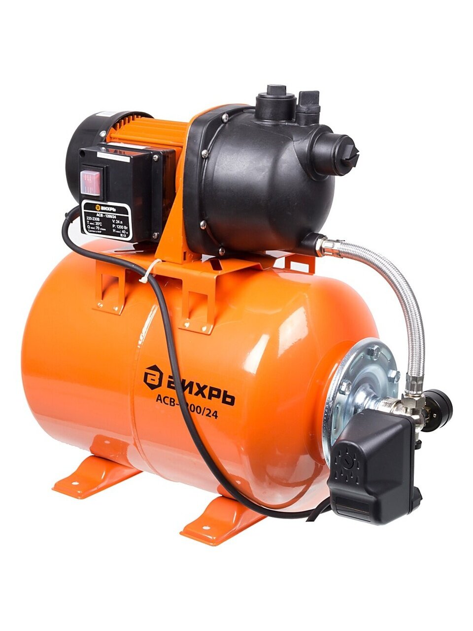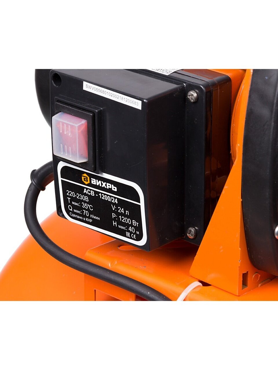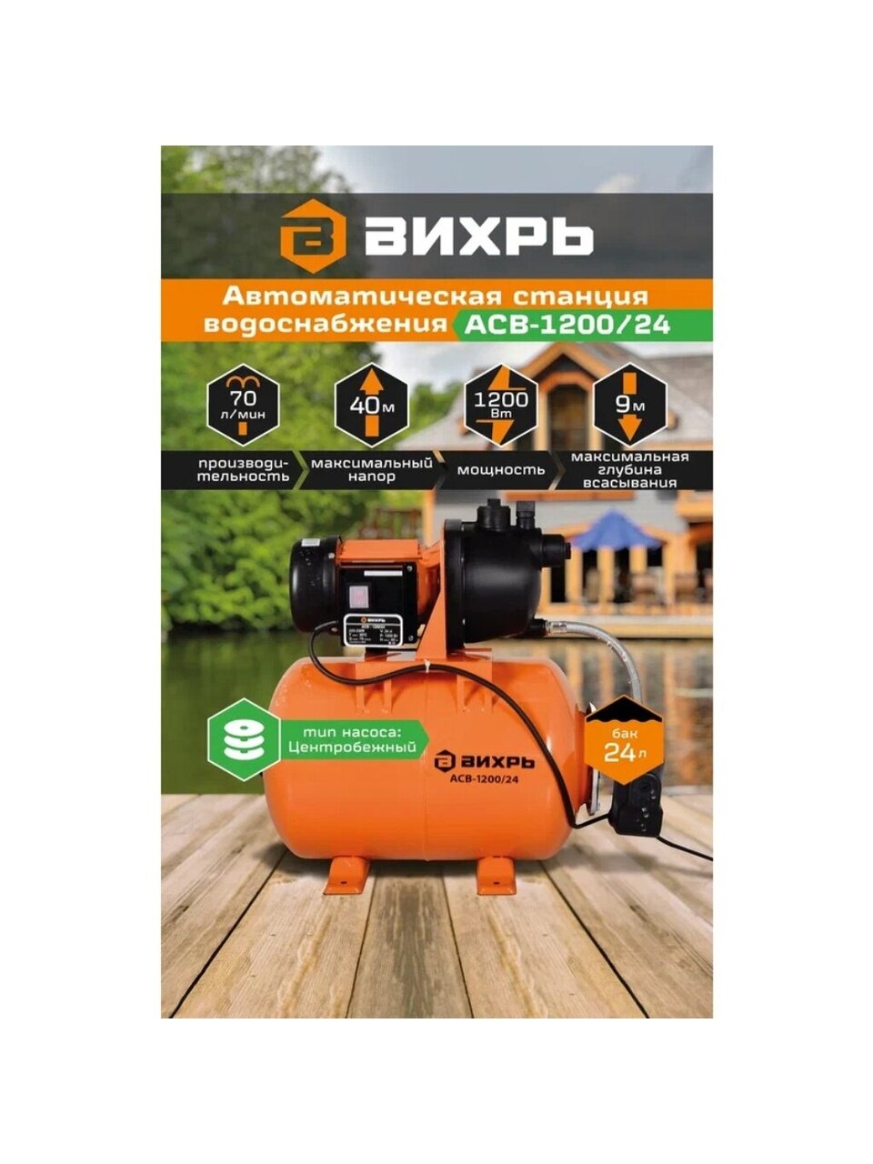 Насосная станция ВИХРЬ АСВ-1200/24 предназначена для бесперебойного водоснабжения в автоматическом режиме, коттеджей, дач, ферм и других потребителей. Данная модель поддерживает необходимое давление в системе водоснабжения, самостоятельно включаясь и отключаясь по мере расходования воды потребителями. АСВ-1200/24 обладает достаточной мощностью 1200 Вт, максимальная глубина всасывания 9 метров, максимальная подача воды 70 литров в минуту, максимальный напор 40 метров. Емкость гидроаккумулятора составляет 24 литра.