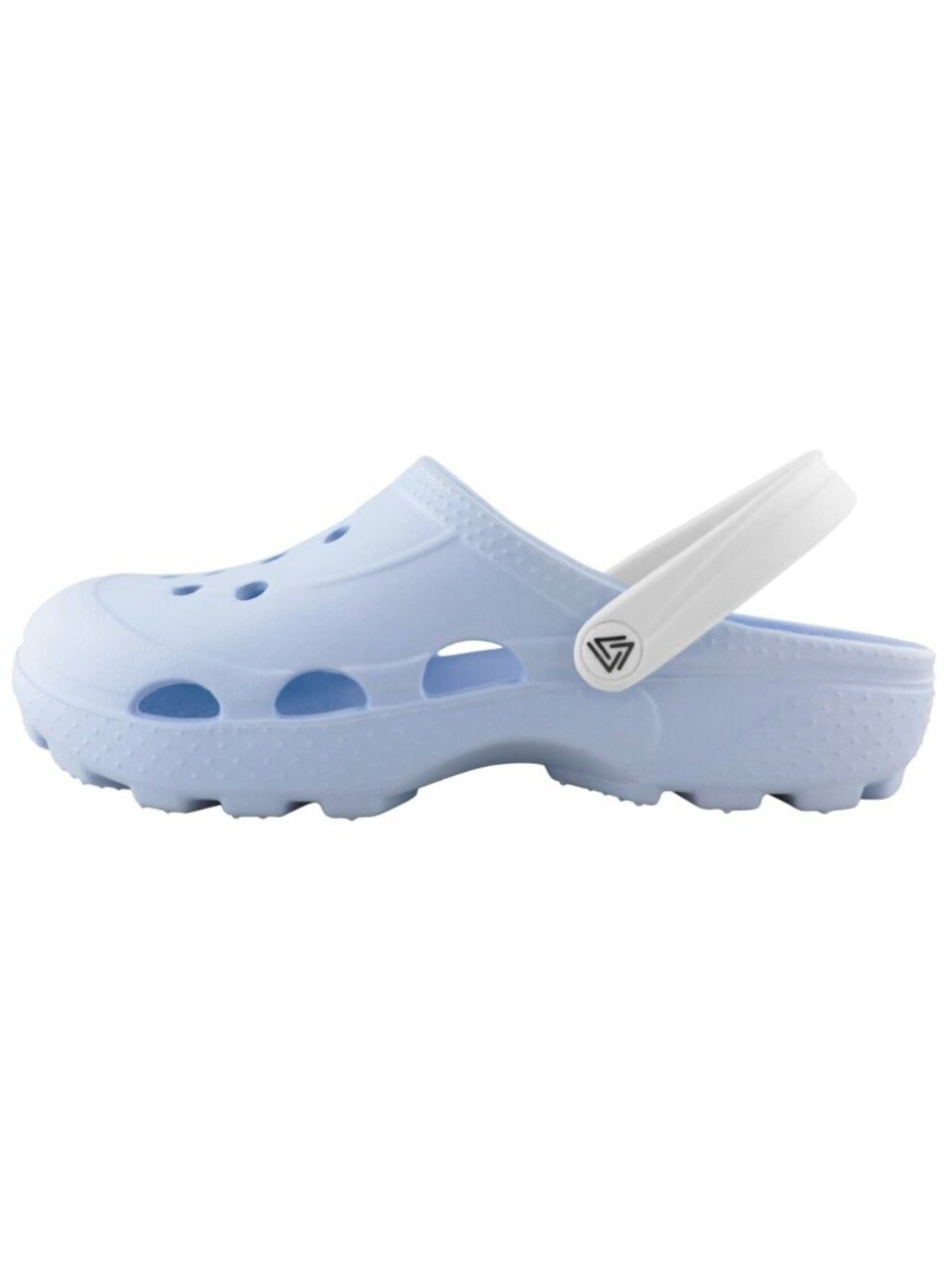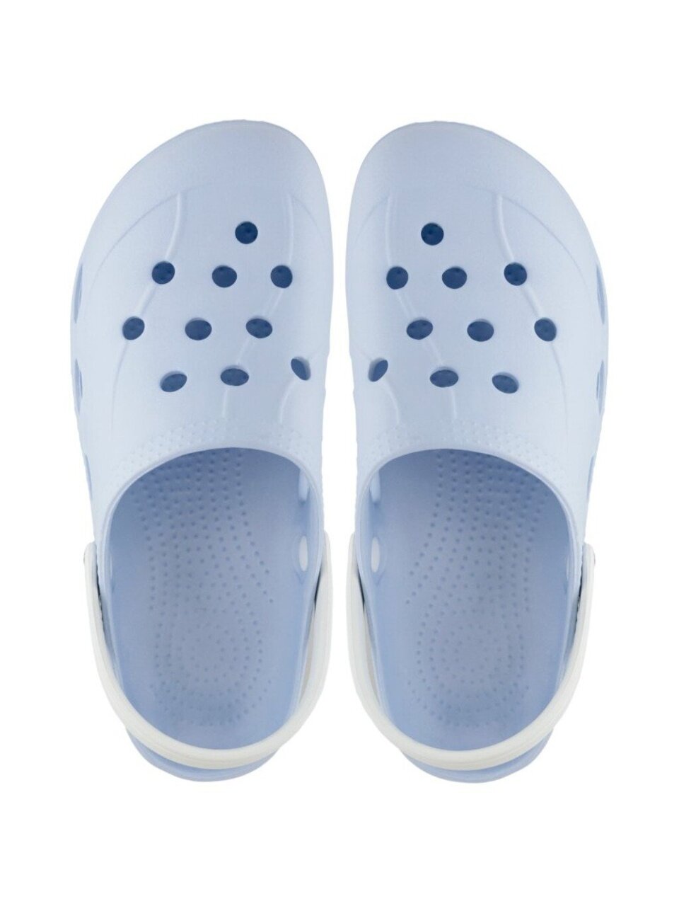 Сабо выполнены из материала ЭВА, который известен своей легкостью и прочностью. Этот материал обеспечивает отличную амортизацию и поддержку стопы, что делает обувь идеальной для длительных прогулок и активного отдыха. Голубой цвет с белыми элементами добавляет свежести и делает обувь стильной и универсальной, подходящей как для повседневного использования, так и для отдыха на пляже.