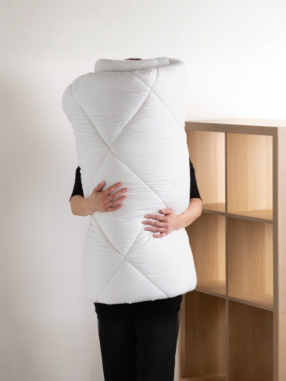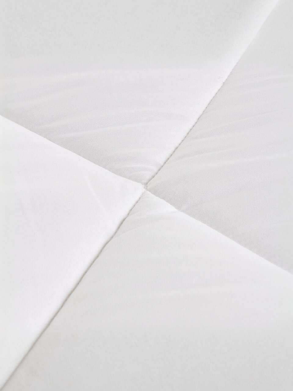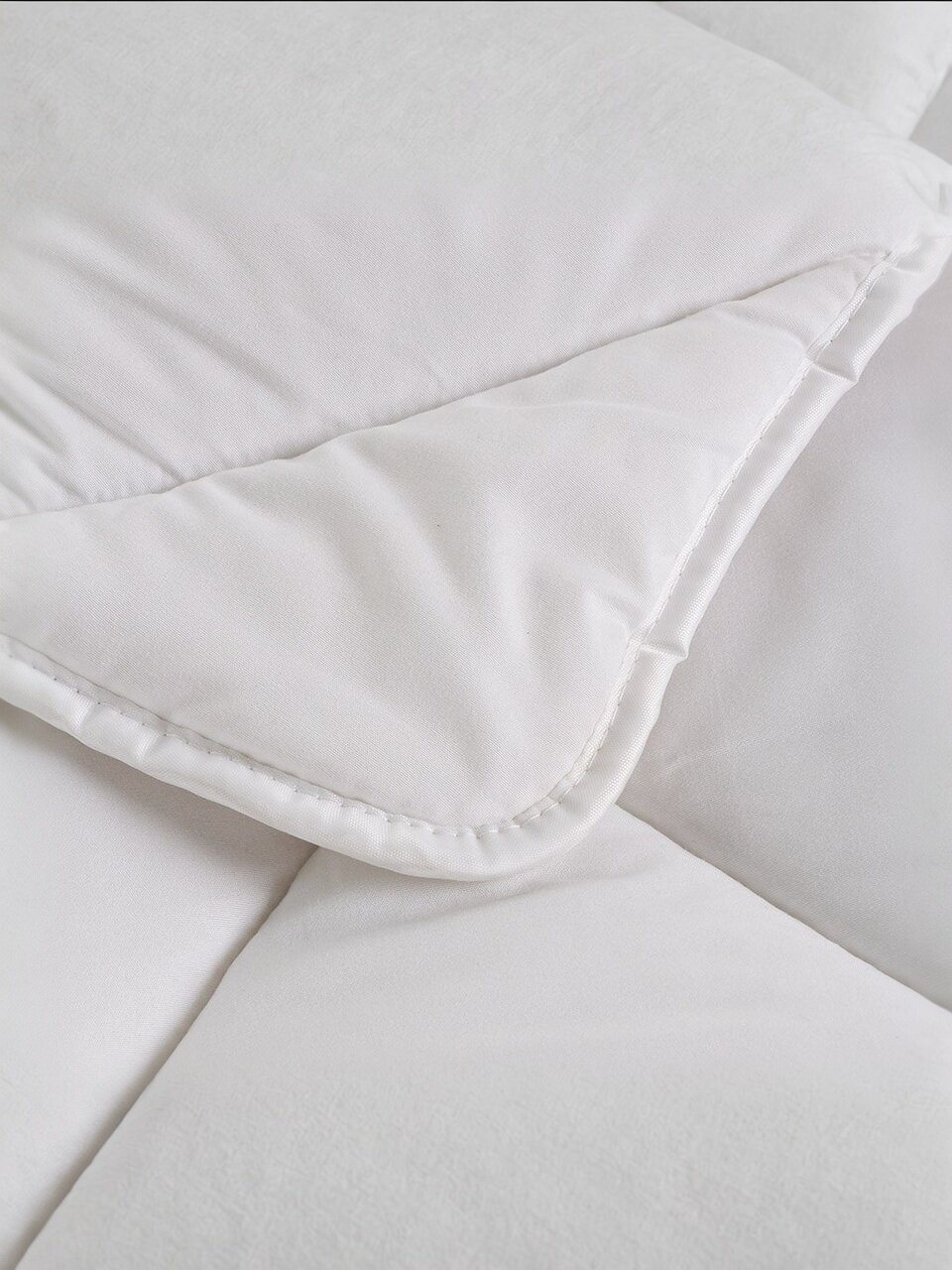 Внутри — современный лебяжий пух (синтетический аналог), который не вызывает аллергию, не сбивается и обеспечивает равномерное распределение тепла.