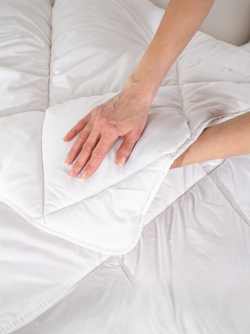 - Всесезонное одеяло с наполнителем из лебяжьего пуха — легкое, теплое, не вызывает аллергию
